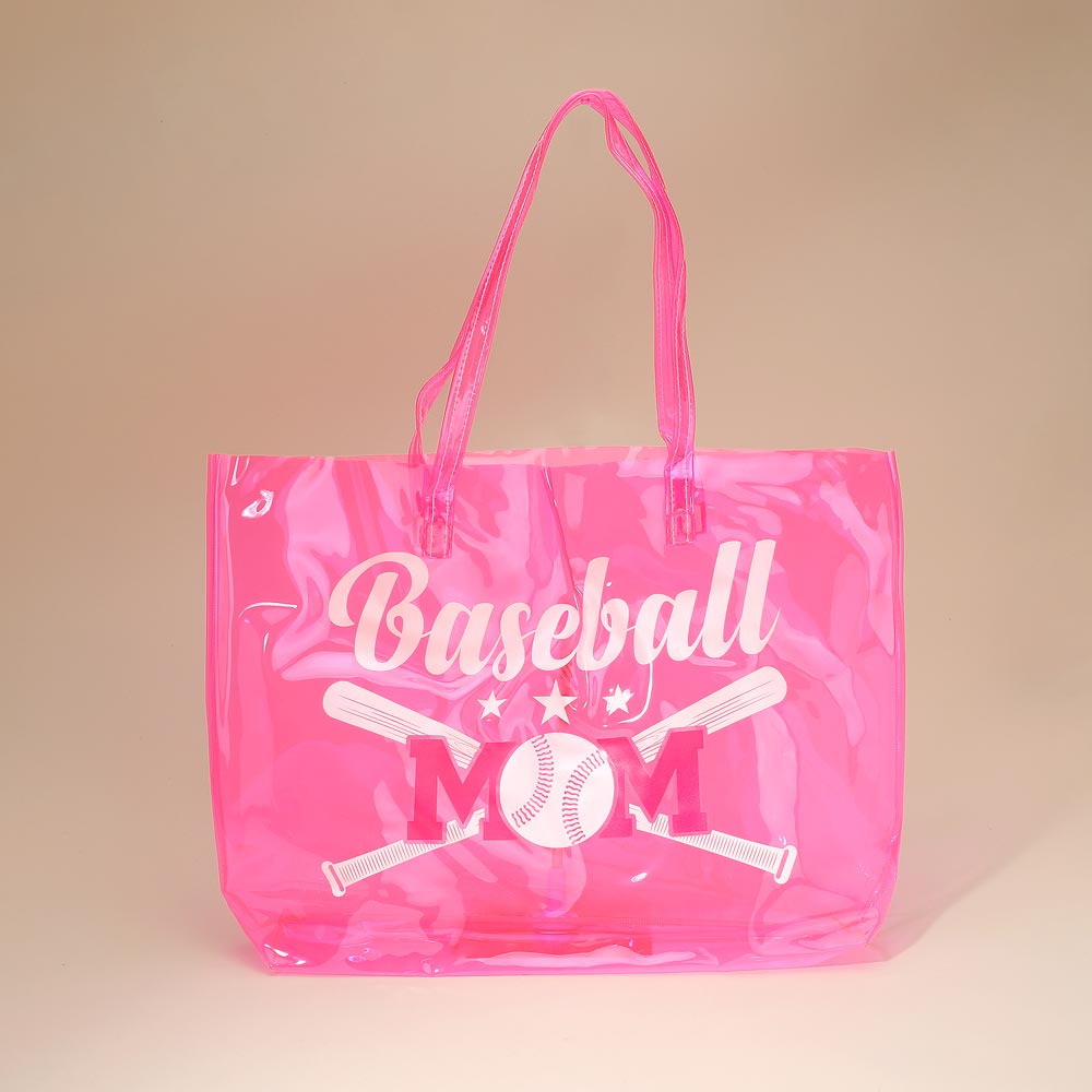 Details • Size : 18" X 11" • Top Handle Size : 9" L • A stylish clear tote bag featuring a bold “Baseball Mom” design, perfect for game days, shopping, travel, and everyday use. Offers roomy storage with comfortable handles, making it ideal for carrying essentials while showing sporty pride on the go.