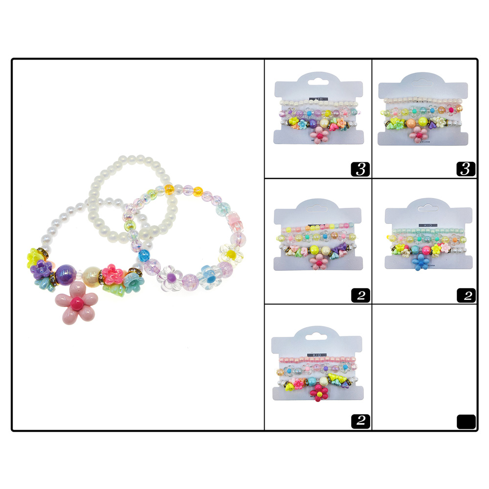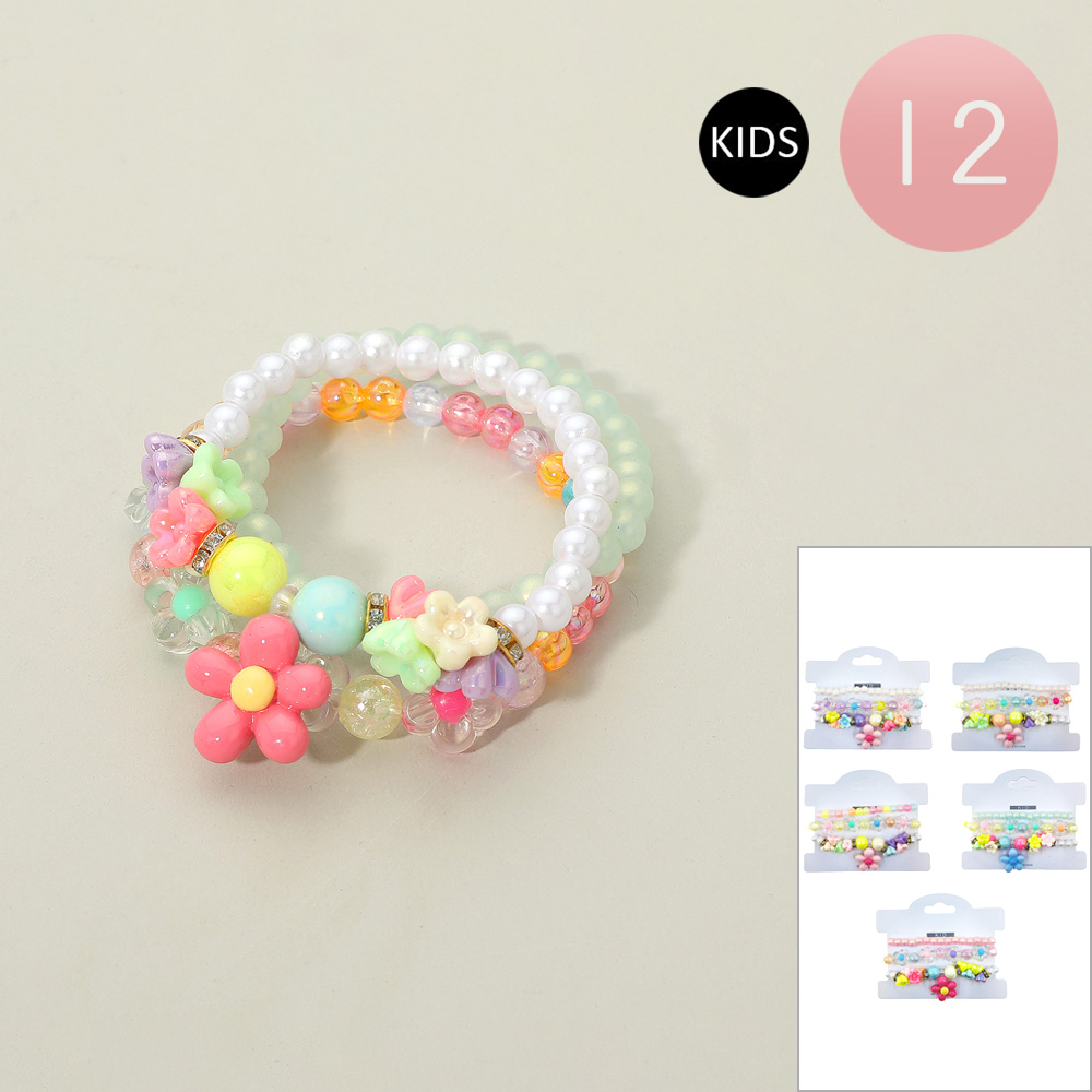 Details • Size : 1.8" H • Stretchable • Charming kids’ bracelet set featuring a flower charm with colorful beads and fun designs. Stretchy and comfortable for little wrists, this 12-piece pack is ideal for gifting, party favors, or daily wear, adding a touch of playful style and cheerful fun to children’s jewelry collections.