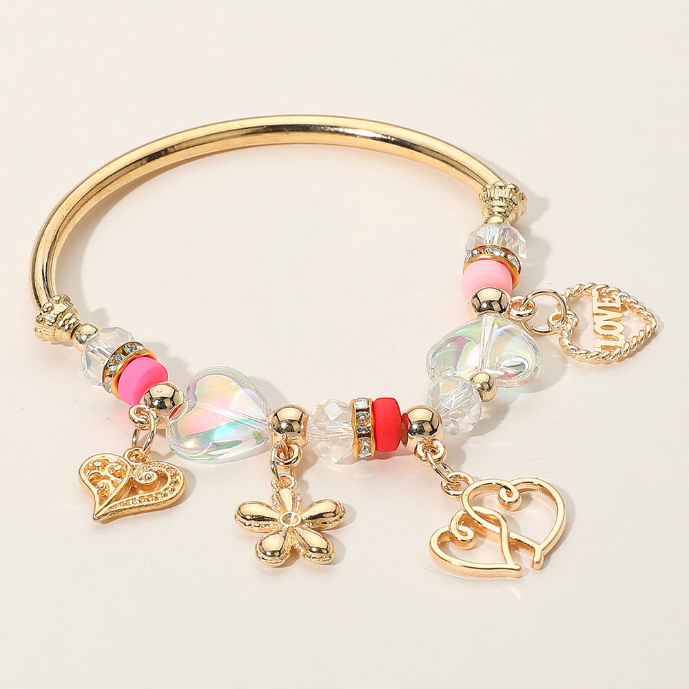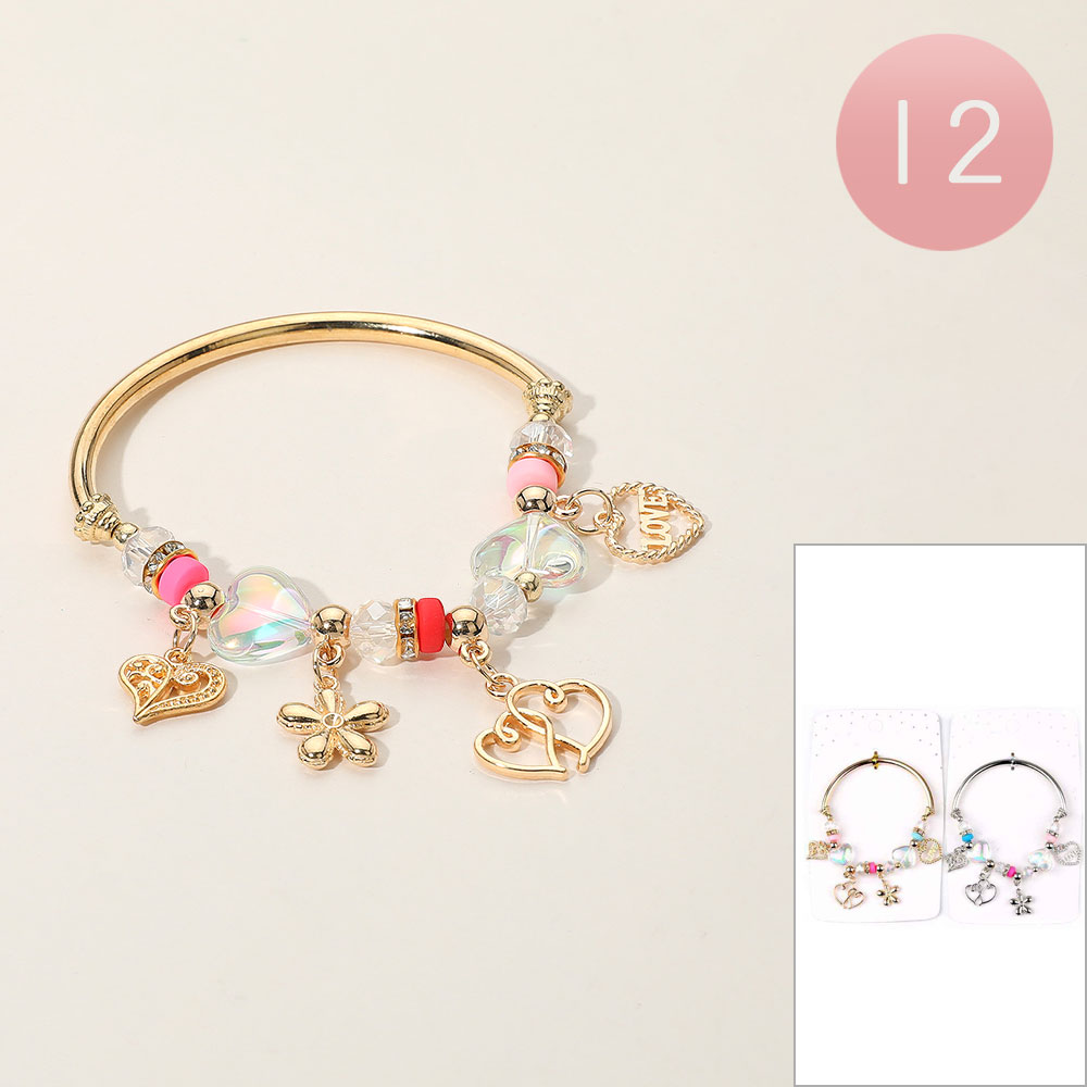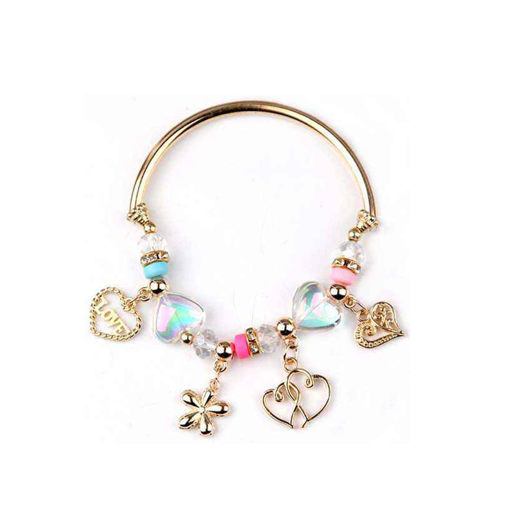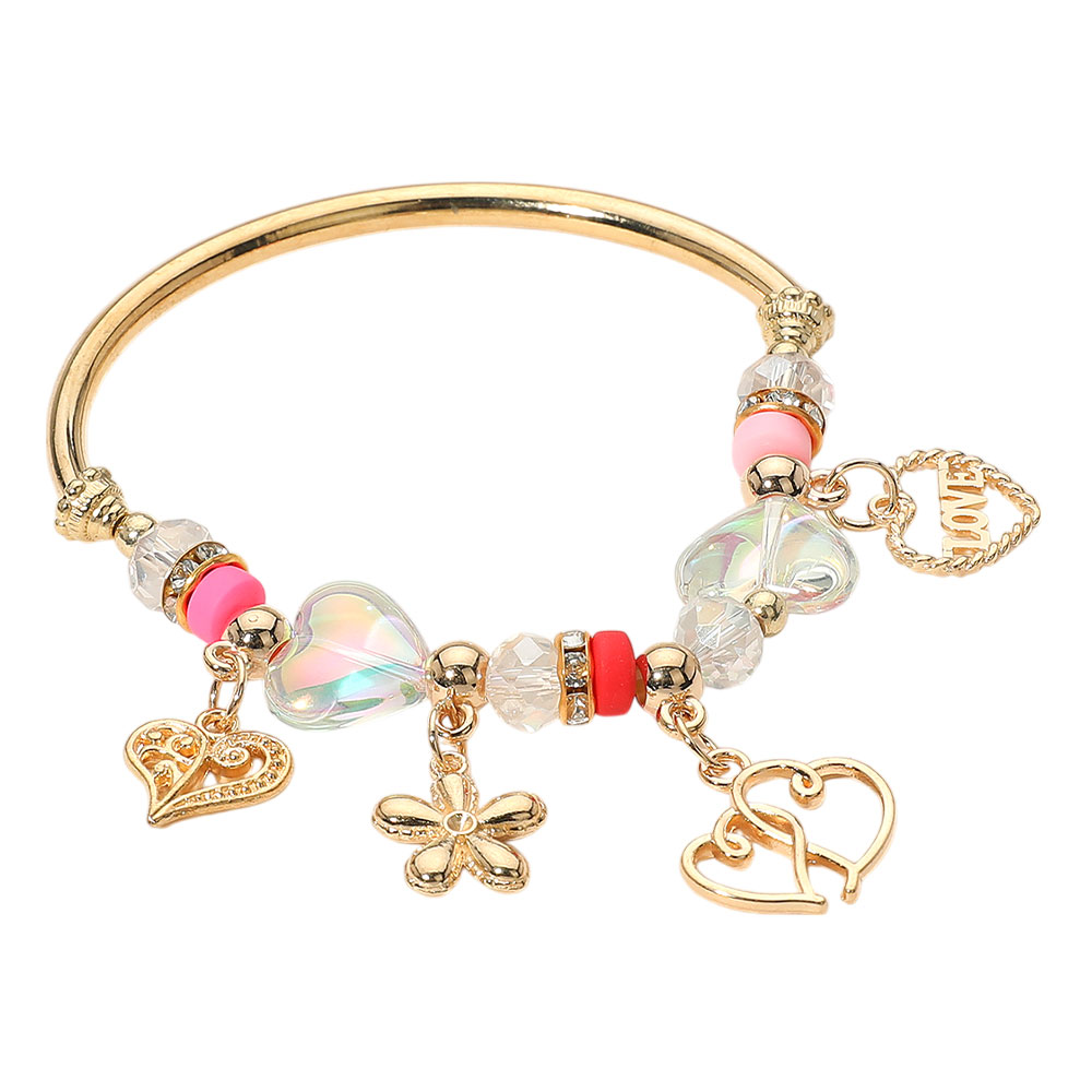Details • Size : 1" H, 2.3" D • Stretchable • Add a playful romantic touch with this gold-tone charm bracelet featuring heart and flower charms, iridescent beads, and vibrant accents. Designed with a half-bangle structure for easy wear and a stylish fit. Perfect for gifting or accessorizing your everyday or Valentine’s Day look. A charming piece full of love and sparkle. • Lead and Nickel Compliant