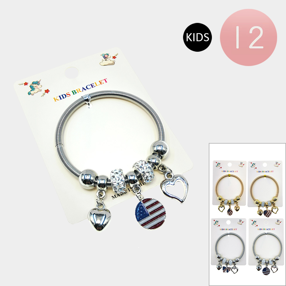 12PCS - Kids Enamel American USA Flag Charm Beaded Stretch Bracelets