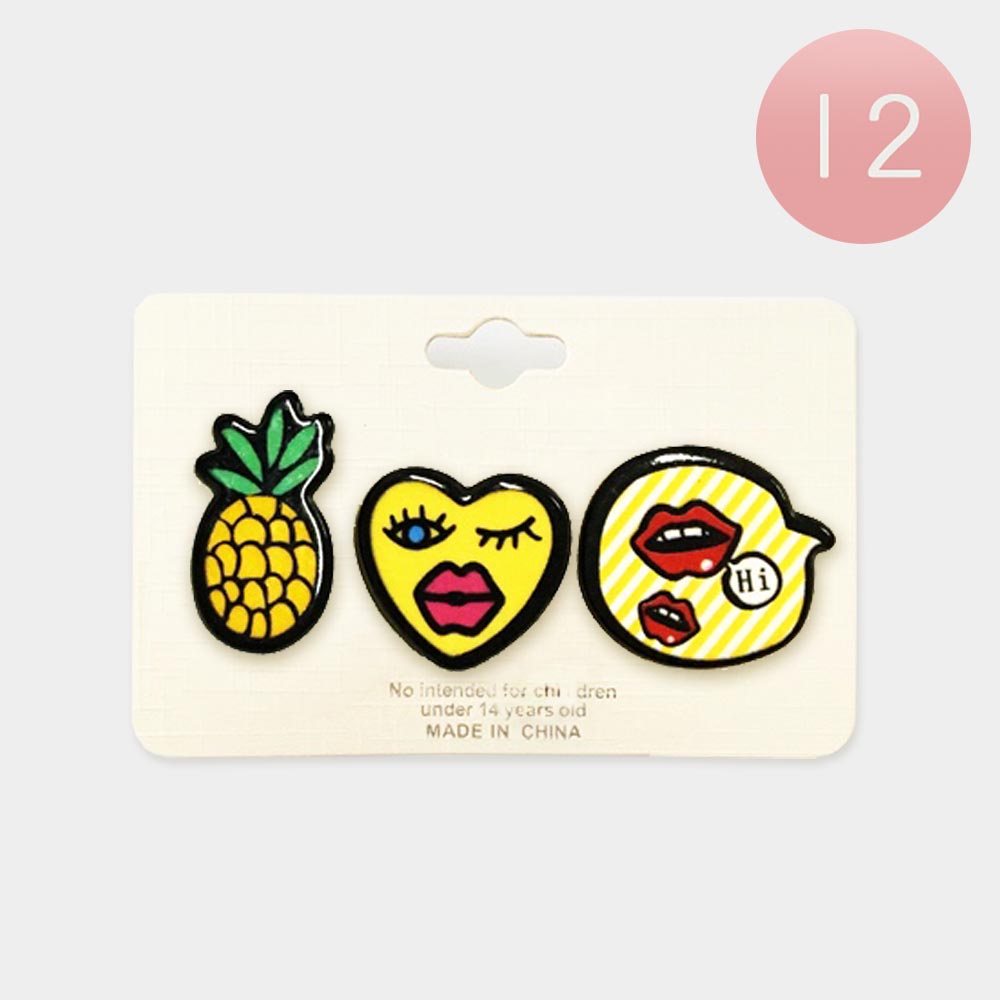 12 Set of 3 - Pineapple Heart Lips Lapel Mini Pin Brooches