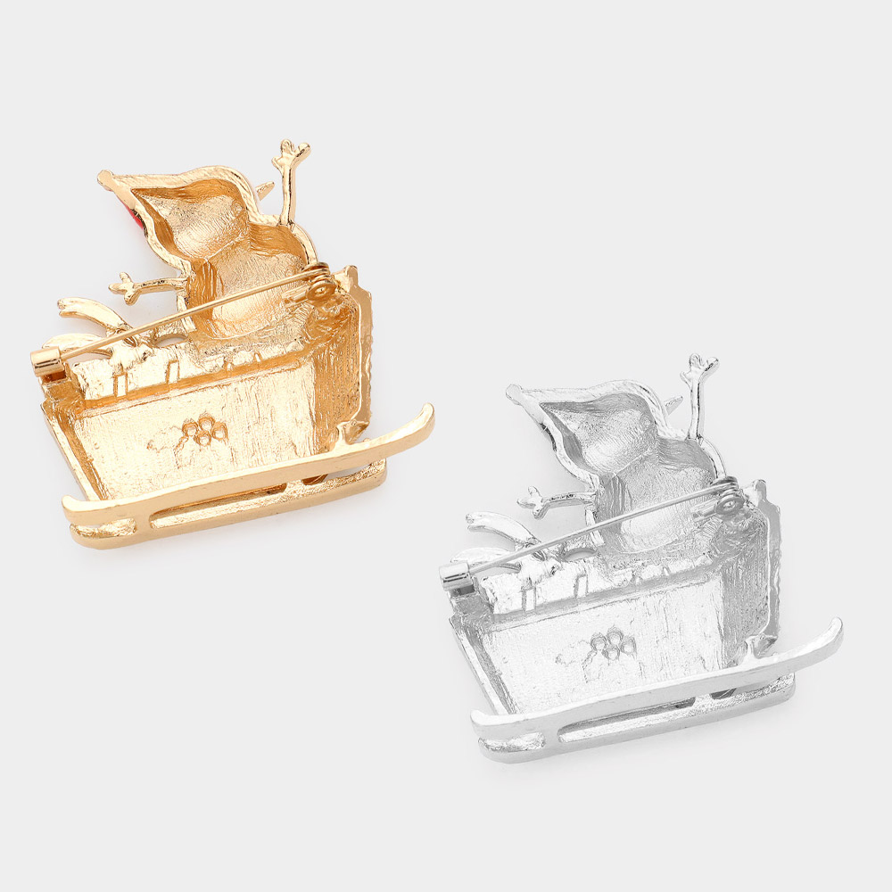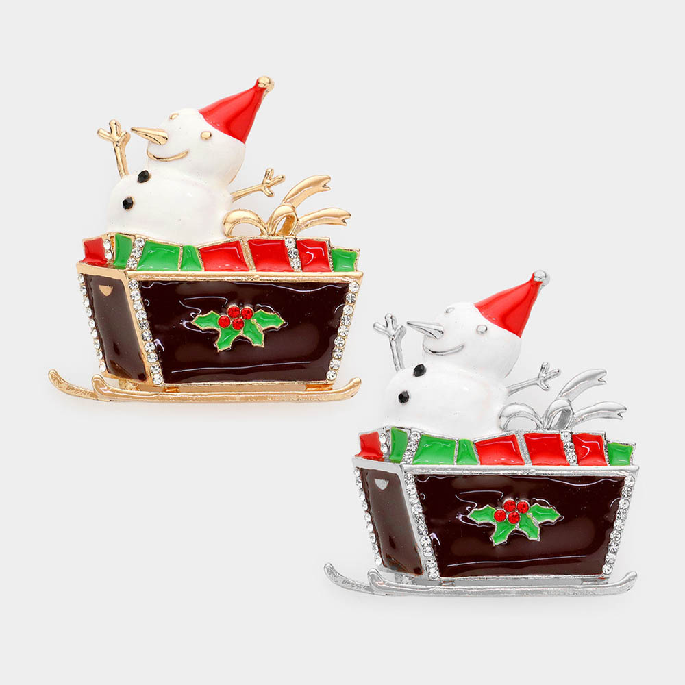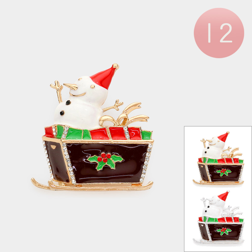 Details • Size : 1.8" X 2" • Pin Brooch • Celebrate the season with this charming 12-piece brooch set featuring a joyful snowman riding in a sleigh. A cheerful holiday accessory ideal for festive outfits, gifts, or party favors. • Lead and Nickel Compliant