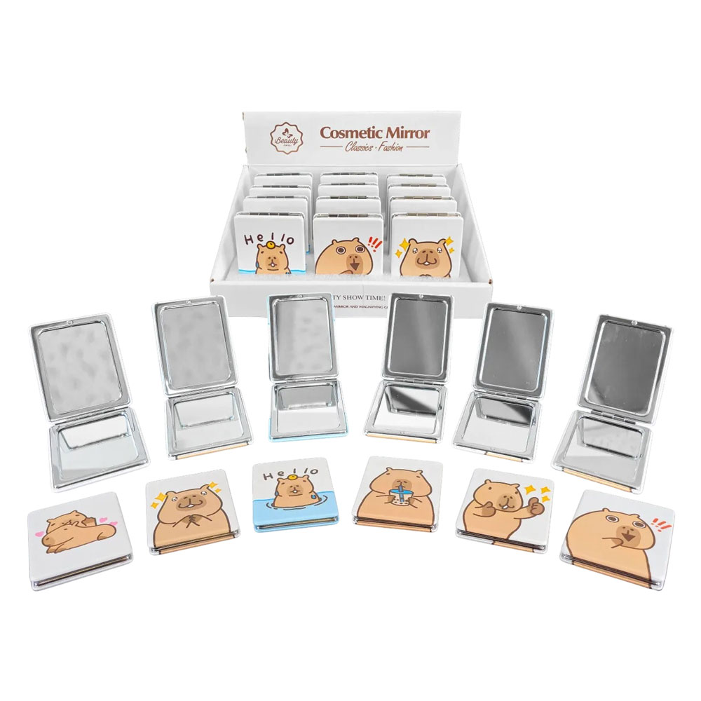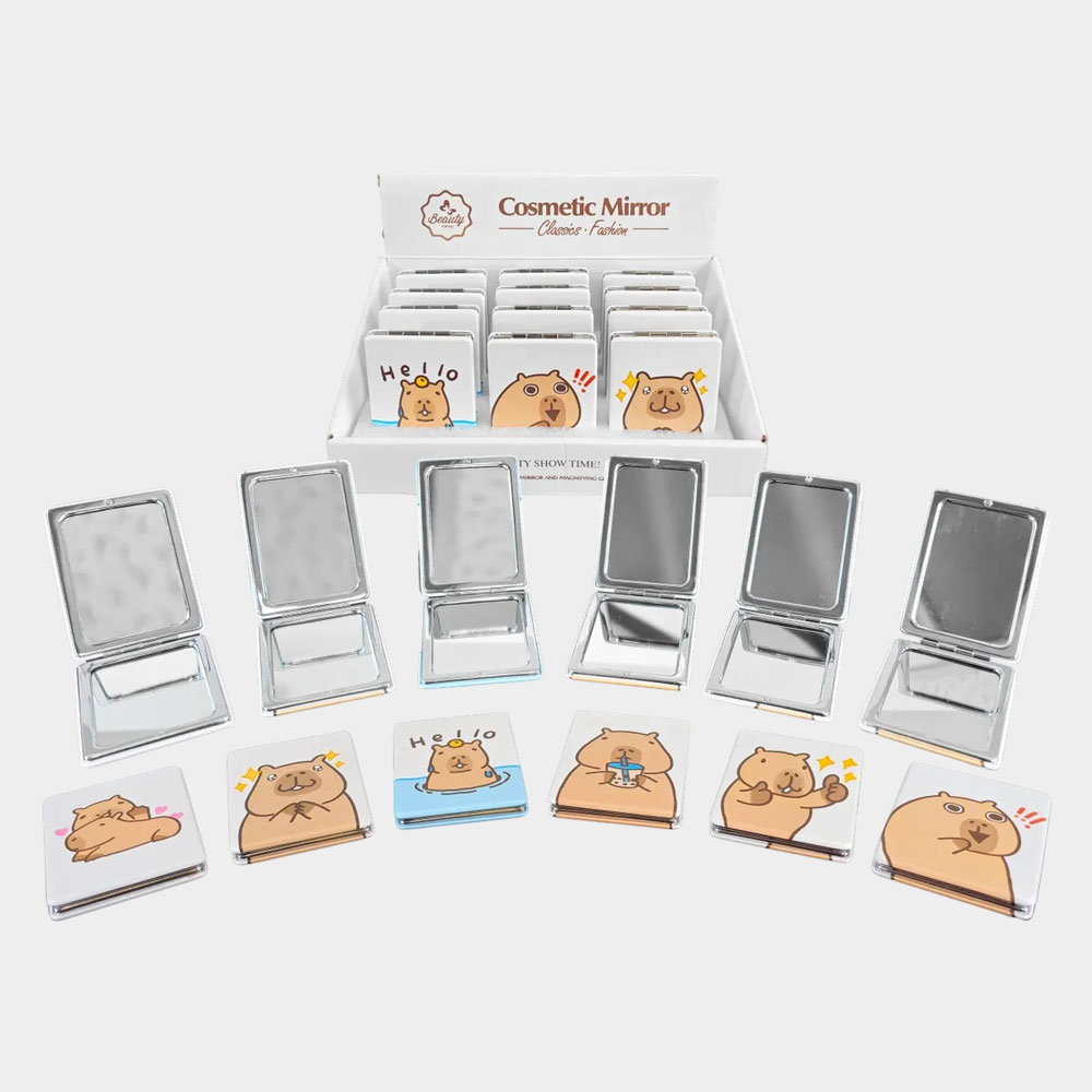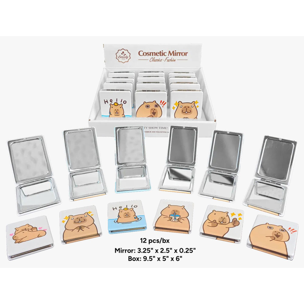 Details • Size : 3.25" X 2.5" X 0.25" • 2 In 1 - Plain Mirror And Magnifying Mirror • Slim rectangular compact mirror with playful capybara designs offers a perfect blend of charm and utility. Ideal for quick makeup touch-ups or daily grooming. Lightweight and easy to carry, it’s a delightful accessory for home, travel, or gifting occasions.