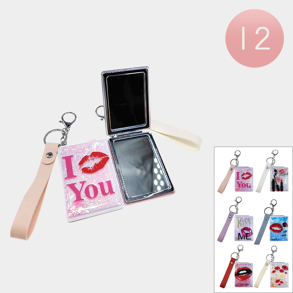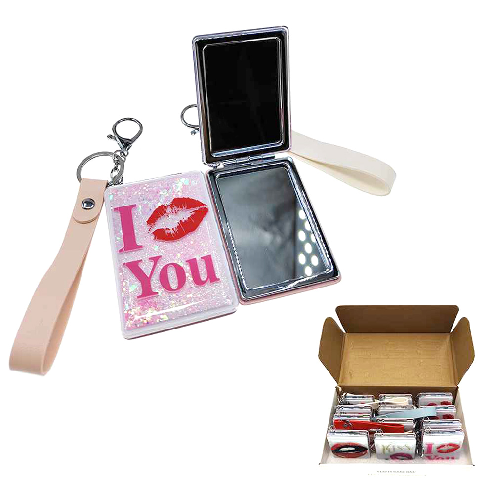 Details • Size : 2.4" X 3.25" • Strap Size : 4" L • 2 In 1 - Plain Mirror And Magnifying Mirror • Glitter “I Love You” compact mirror keychain featuring dual mirrors, secure clasp, and convenient wrist strap for quick touch-ups on the go. Perfect for gifting, party favors, travel kits, or adding a sweet, practical accessory to keys, purses, backpacks, and cosmetic bags.