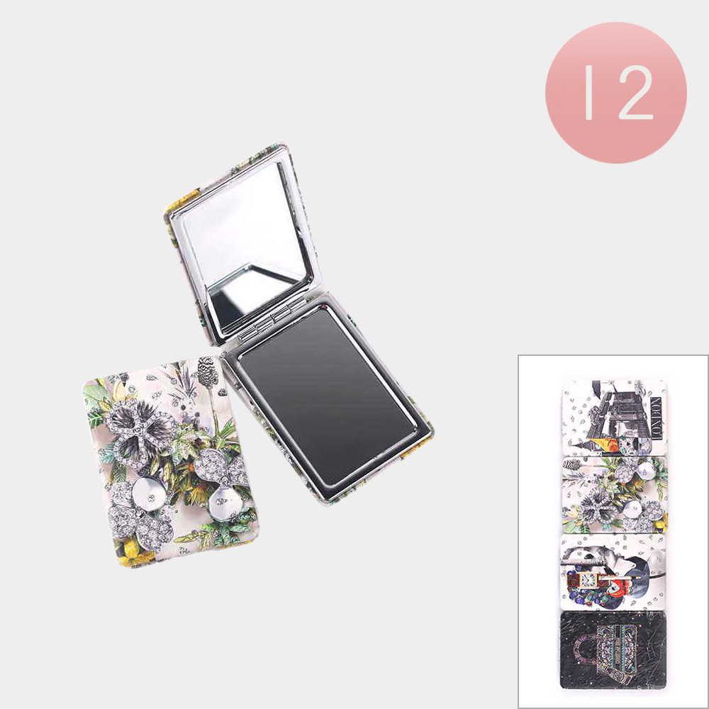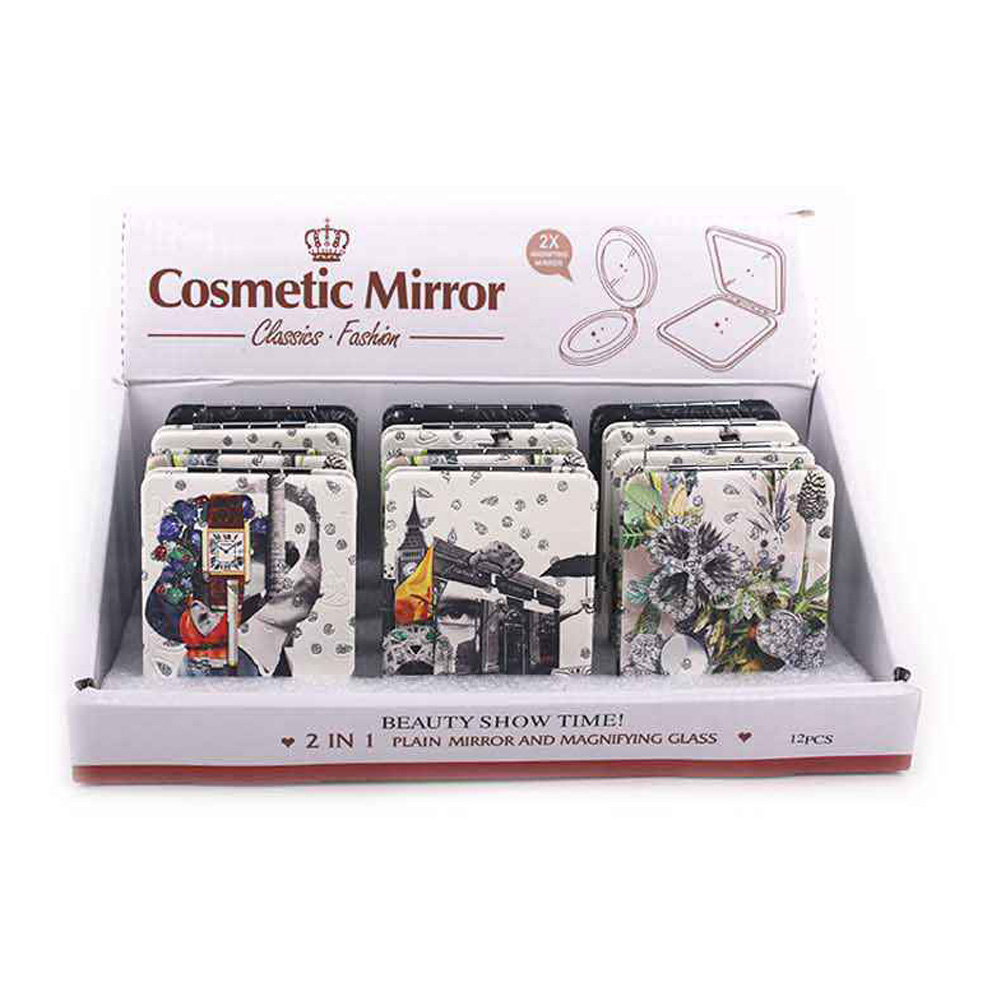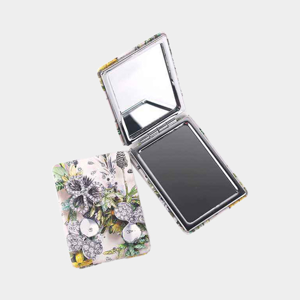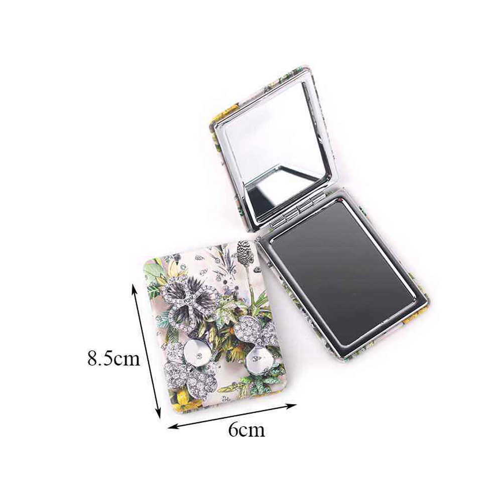 Details • Size : 2.4" X 3.3" • 2 In 1 - Plain Mirror And Magnifying Mirror • Portable double-sided mirror featuring stylish artistic prints and sparkling details. Slim and lightweight, ideal for handbags or travel, offering both regular and magnified views for convenient touch-ups anywhere.