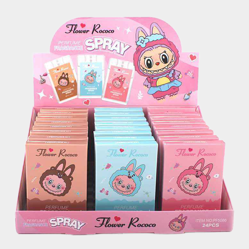 Details • Size : 20ml • Enjoy on-the-go freshness with this 24-piece assorted perfume spray set featuring slim, pocket-size bottles in fun character packaging. Perfect for daily use, travel, or gifting, each spray offers a refreshing fragrance. Ideal for party favors, retail display, or adding variety to your collection.