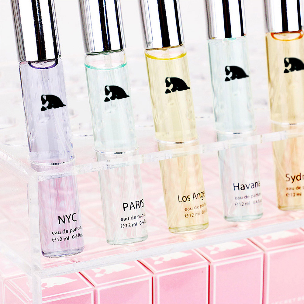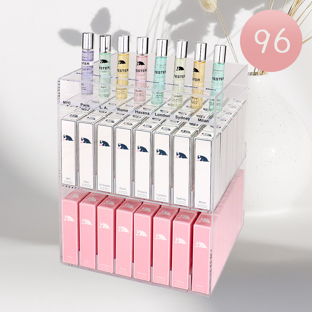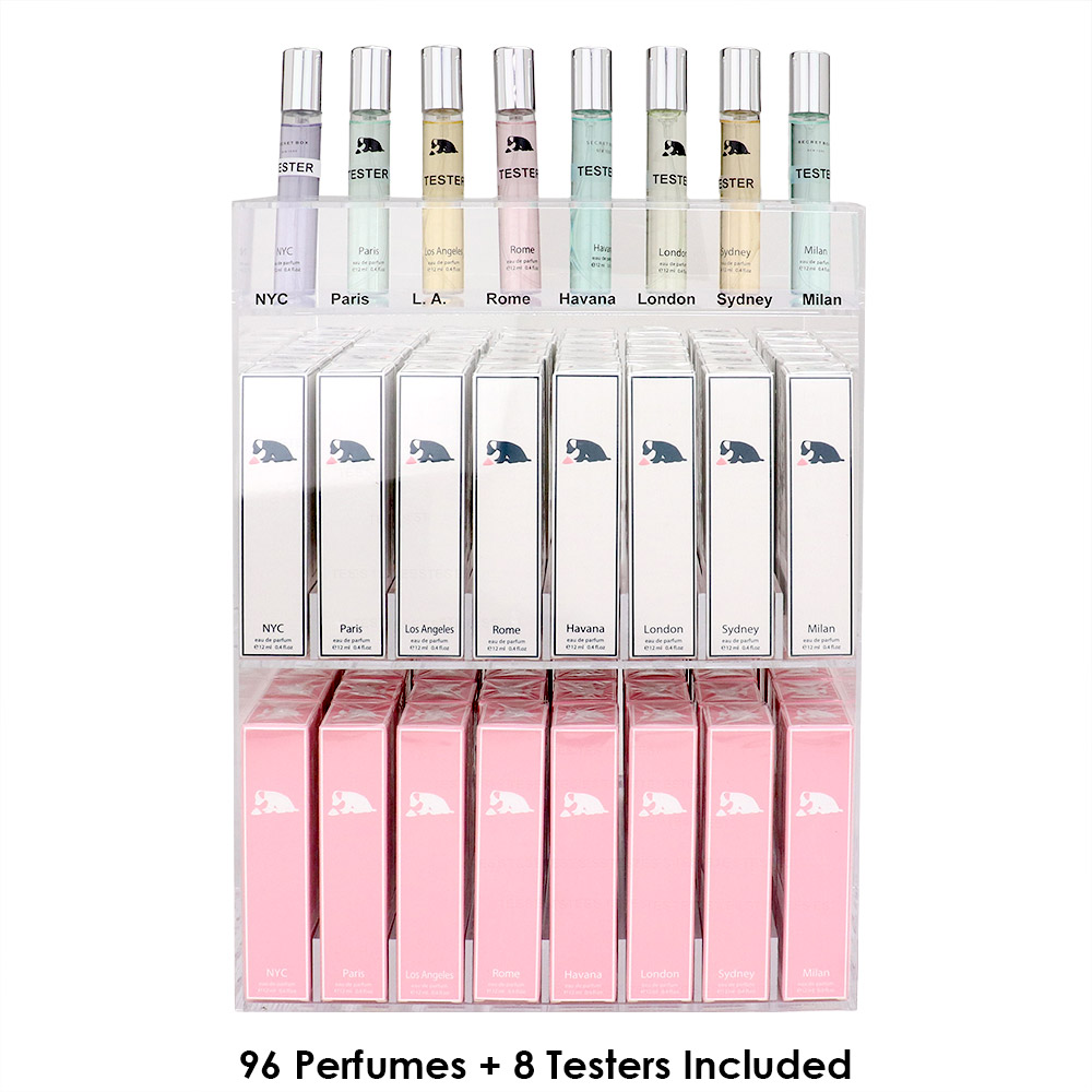Details • Size : 0.4 fl.oz (12ml) Each Perfume • Box Size : 1" X 4.25" • Display Case : 9" X 12.5" X 6.5" • 8 Testers Included • Stock up with this 96-piece perfume spray set featuring 12ml bottles in assorted fragrances and pastel packaging. Perfect for retail display, bulk gifting, or personal use, these compact sprays are easy to carry and deliver refreshing scents for any occasion. Ideal for boutiques or beauty shops.