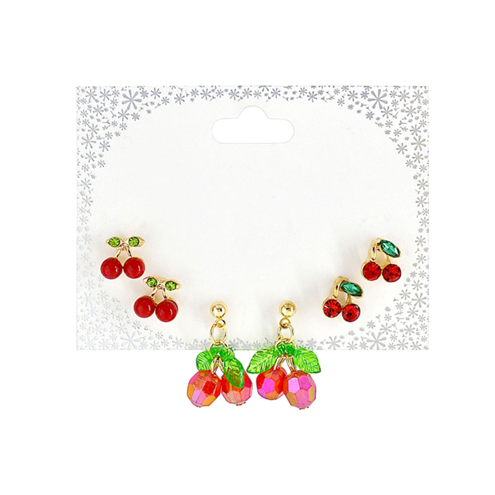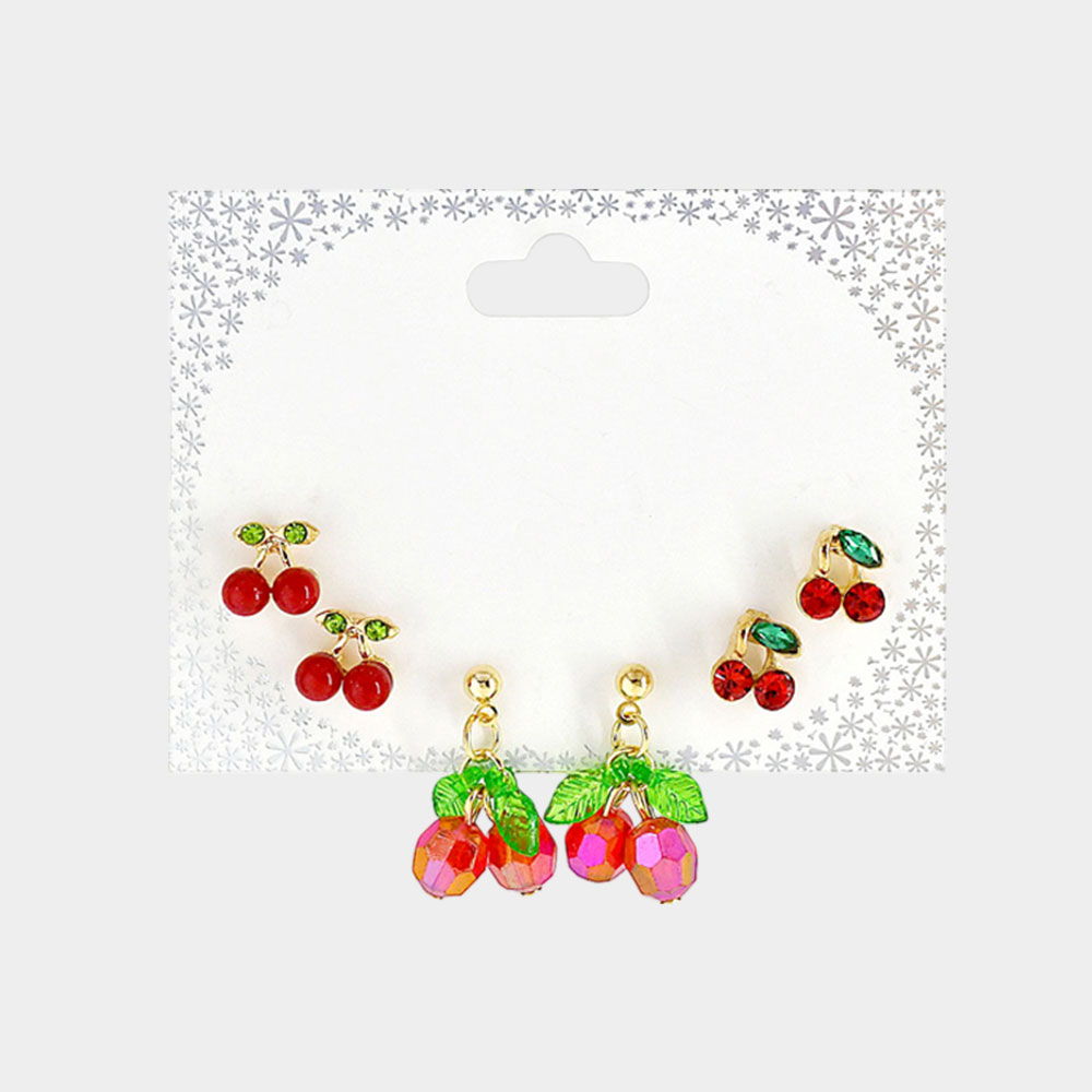 • Add a touch of charm with this 3-pair cherry earring set featuring fun stud and drop designs. Ideal for daily wear, gifting, or creating a whimsical accessory look that stands out.