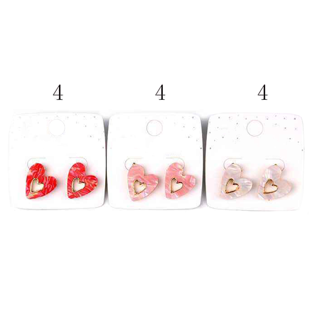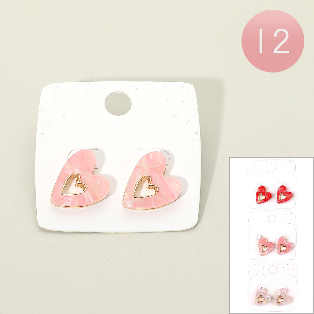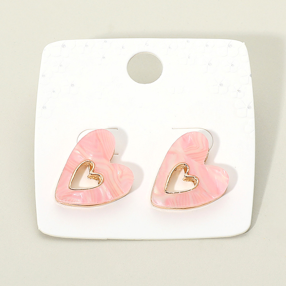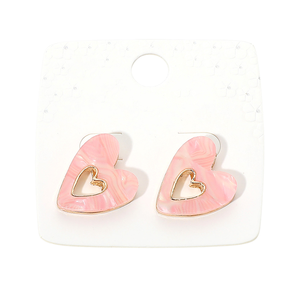 Details • Size : 0.75" X 0.9" • Post Back • Express your playful charm with these heart-shaped stud earrings featuring a marbled finish and inner heart cutout. Their modern, layered silhouette adds visual interest and a touch of sweetness—perfect for everyday wear or gifting on special occasions.