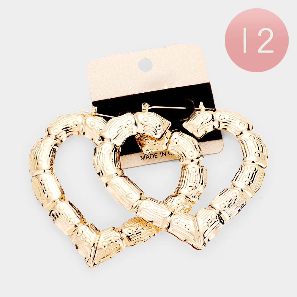 12Pairs- Metal Bamboo Heart Pin Catch Earrings