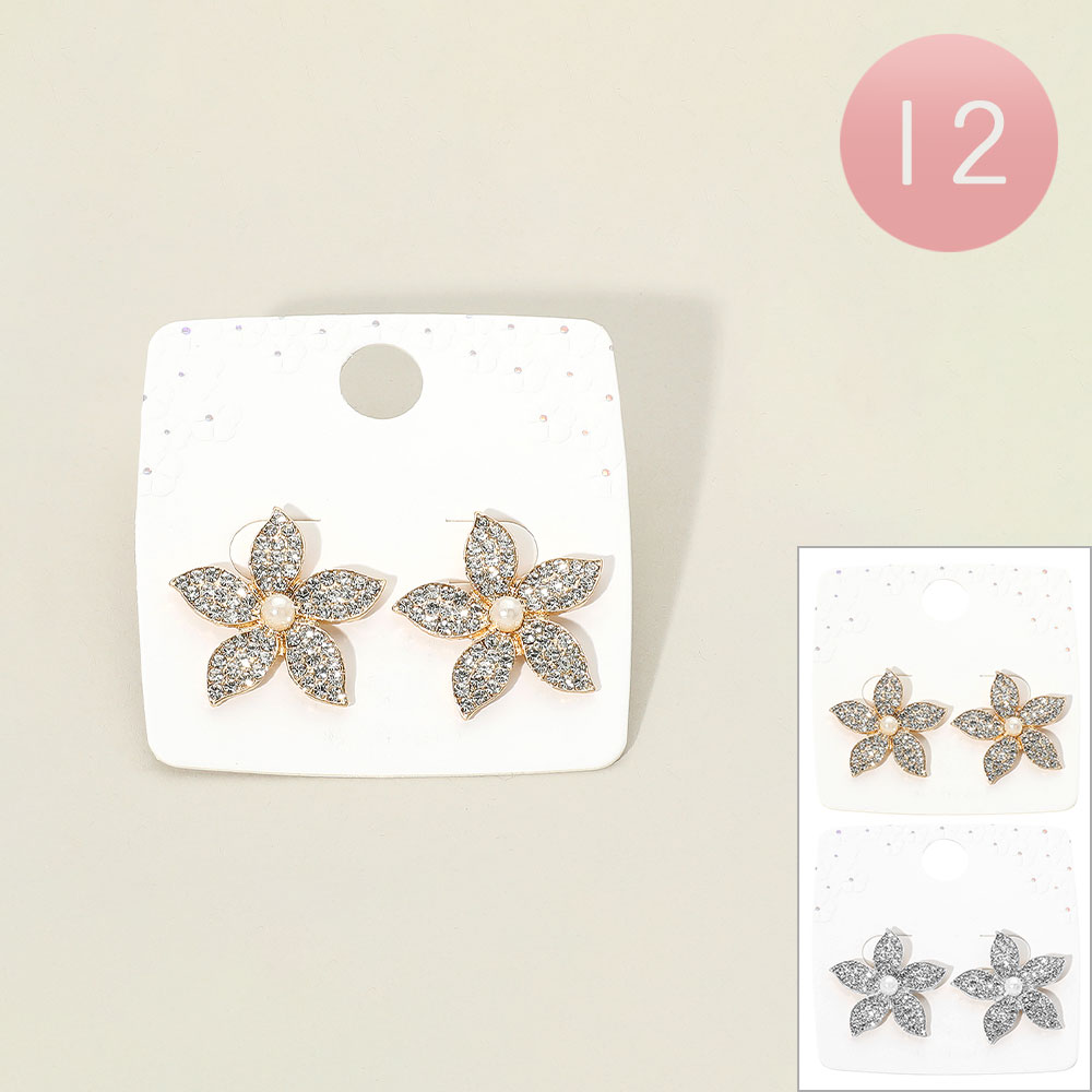12Pairs - Pearl Centered Stone Paved Flower Earrings
