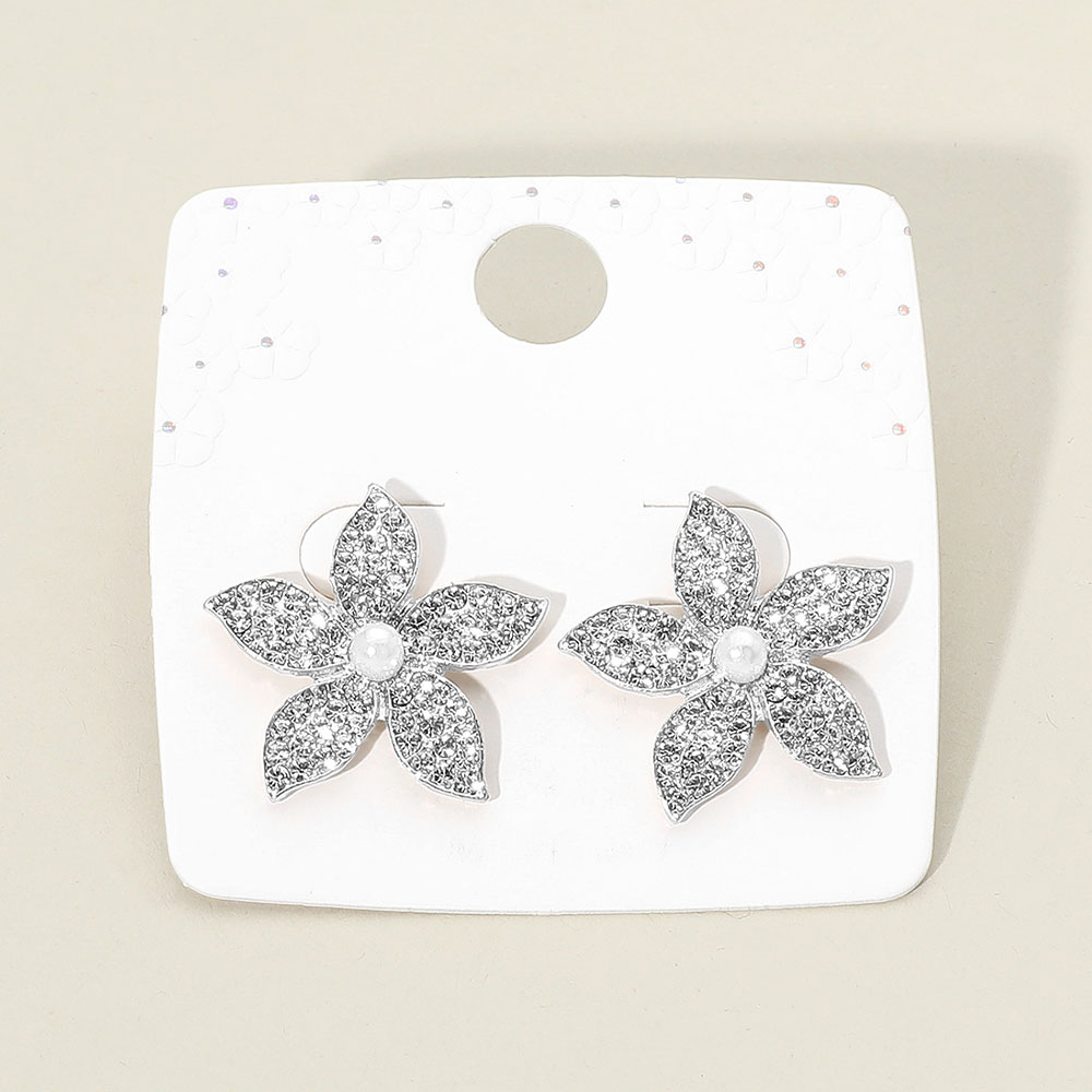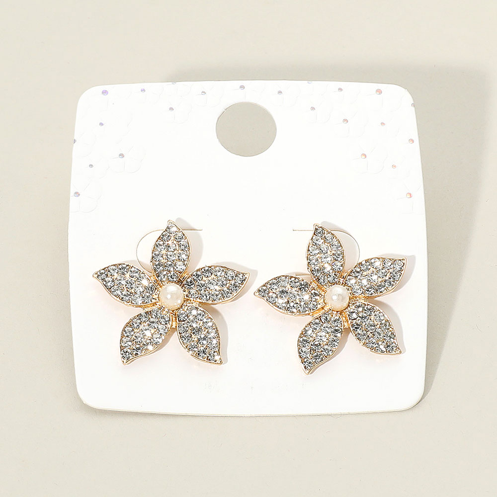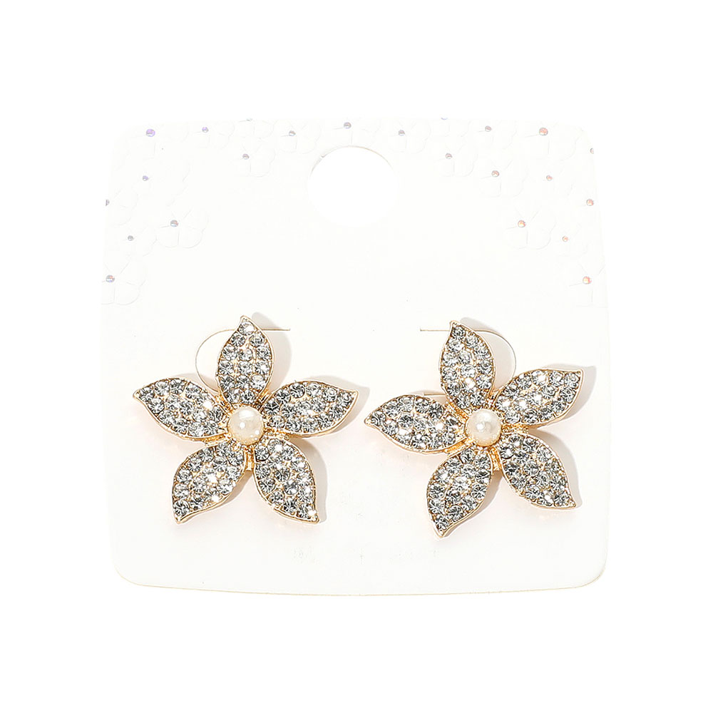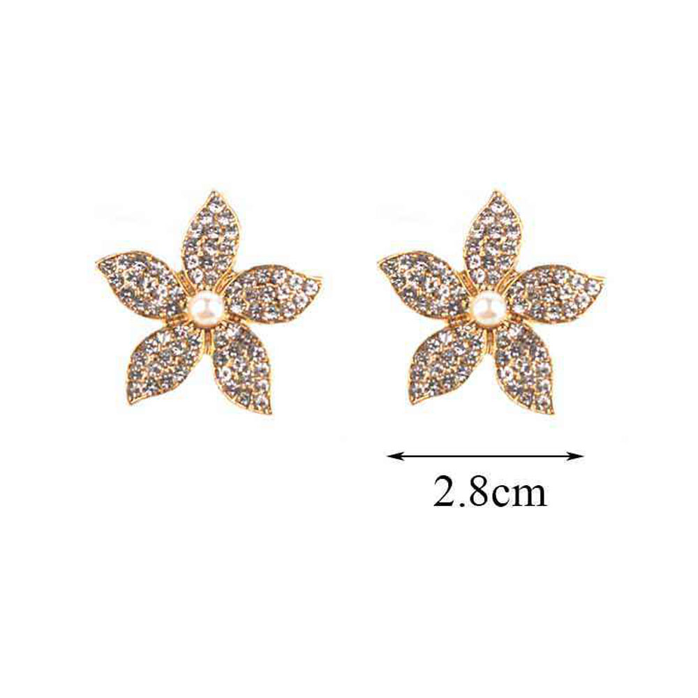 • Chic five-petal flower stud earrings adorned with shimmering crystals and a pearl center. Perfect for adding elegance to everyday or special occasion looks.
