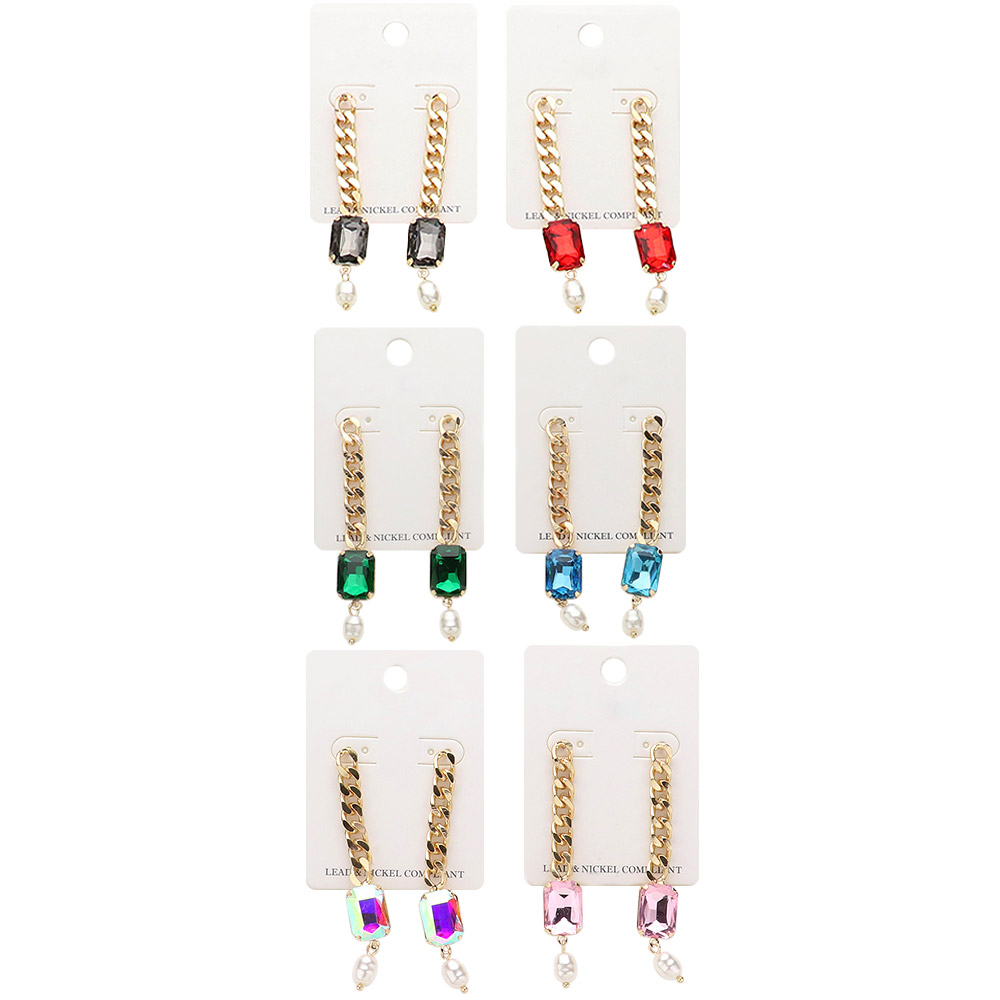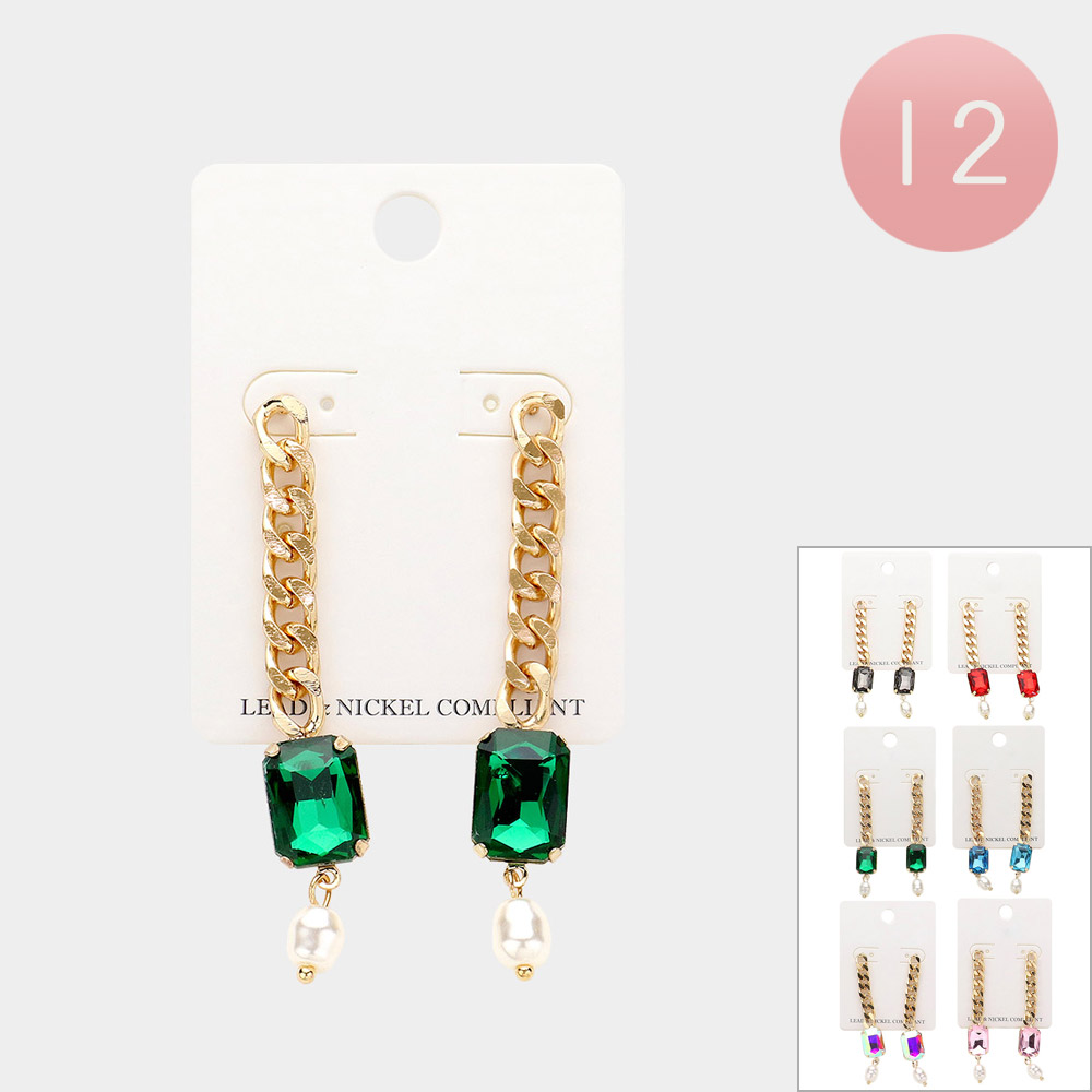 Details • Size : 0.4" X 2.6" • Post Back • Elevate your look with this 12-piece set of chain drop gemstone earrings, featuring bold links, faceted stones, and pearl-style accents. Perfect for adding glam to casual or dressy outfits, these statement earrings bring color, shine, and versatility to your jewelry rotation. • Lead and Nickel Compliant
