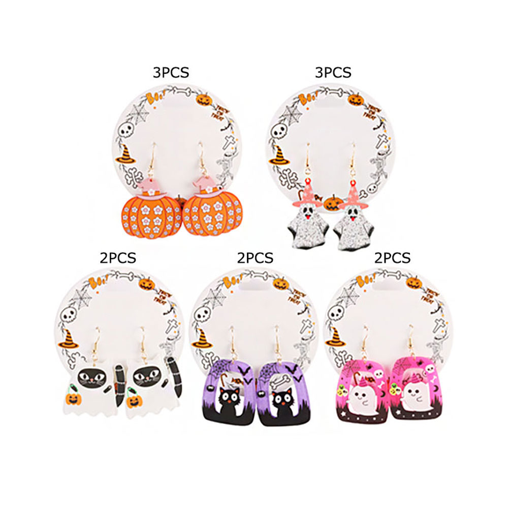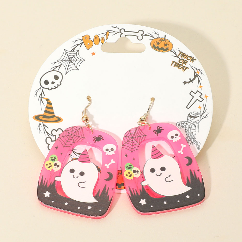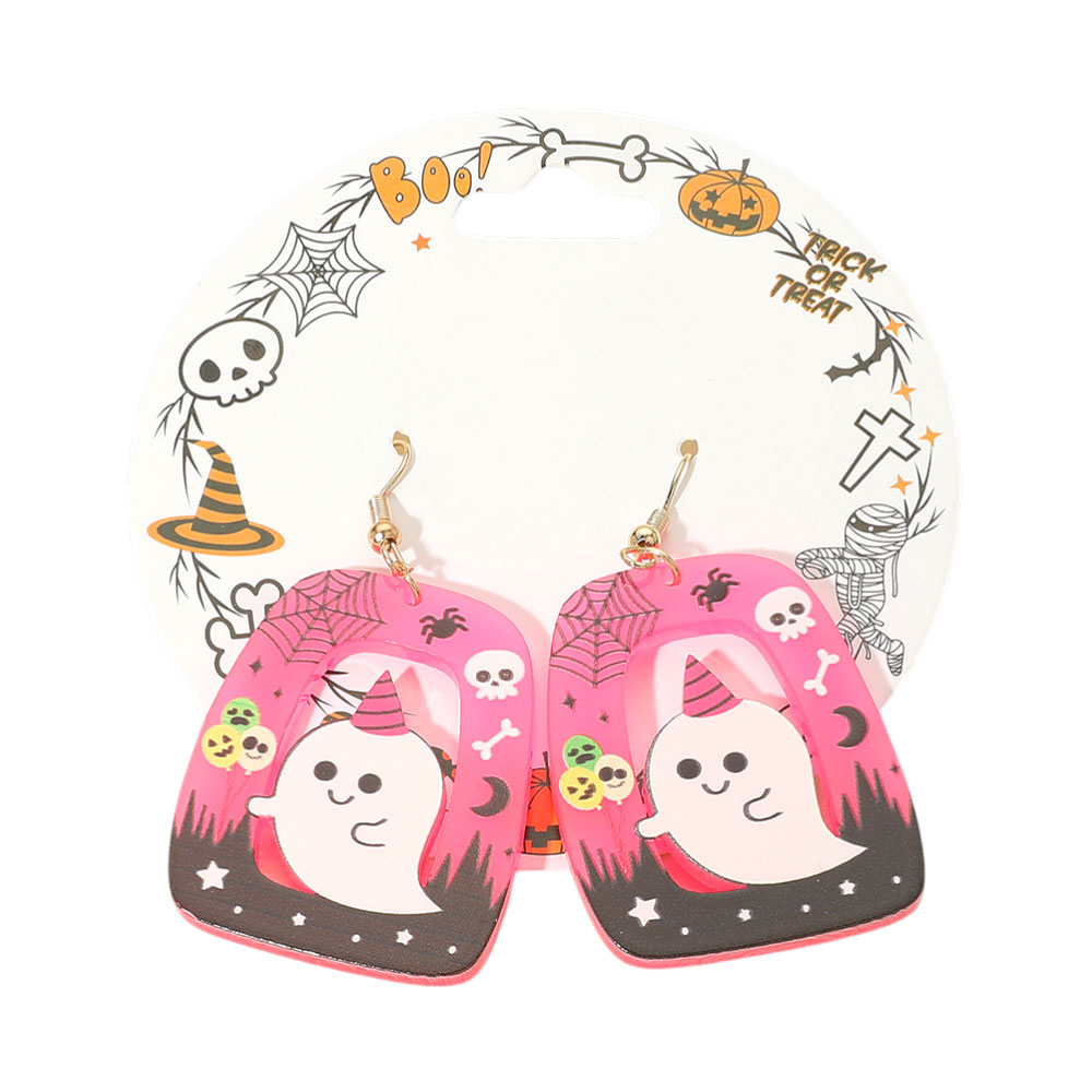 Details • Size : 2.25" L - 2.6" L • Post Back • Playful Halloween dangle earrings featuring a cheerful cartoon ghost and festive background elements. Lightweight and colorful, these fun earrings are perfect for adding seasonal charm to your outfit. Ideal for parties, costumes, or showing off your spooky spirit.