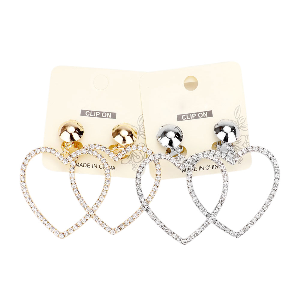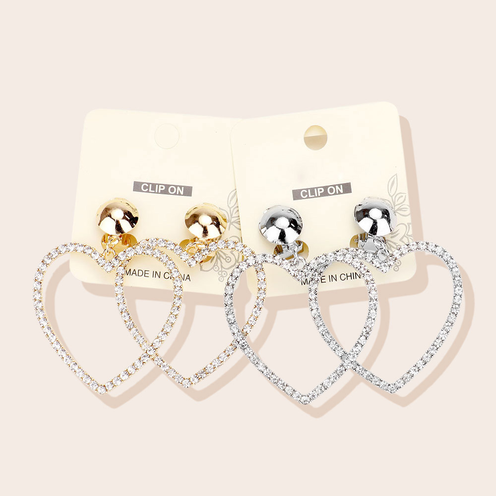 12Pairs - Rhinestone Open Heart Link Dangle Clip on Earrings