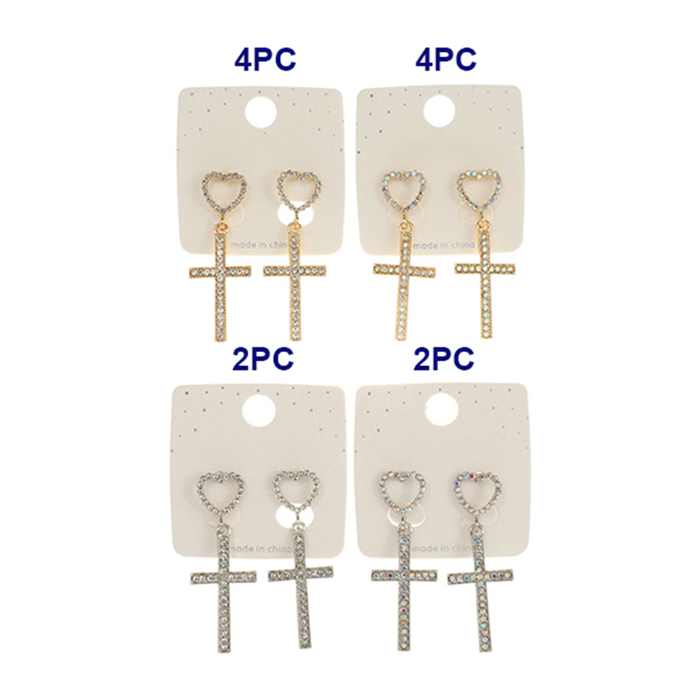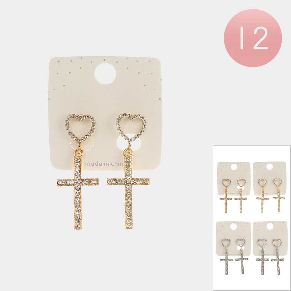 12PAIRS - Stone Paved Heart Cross Dangle Earrings