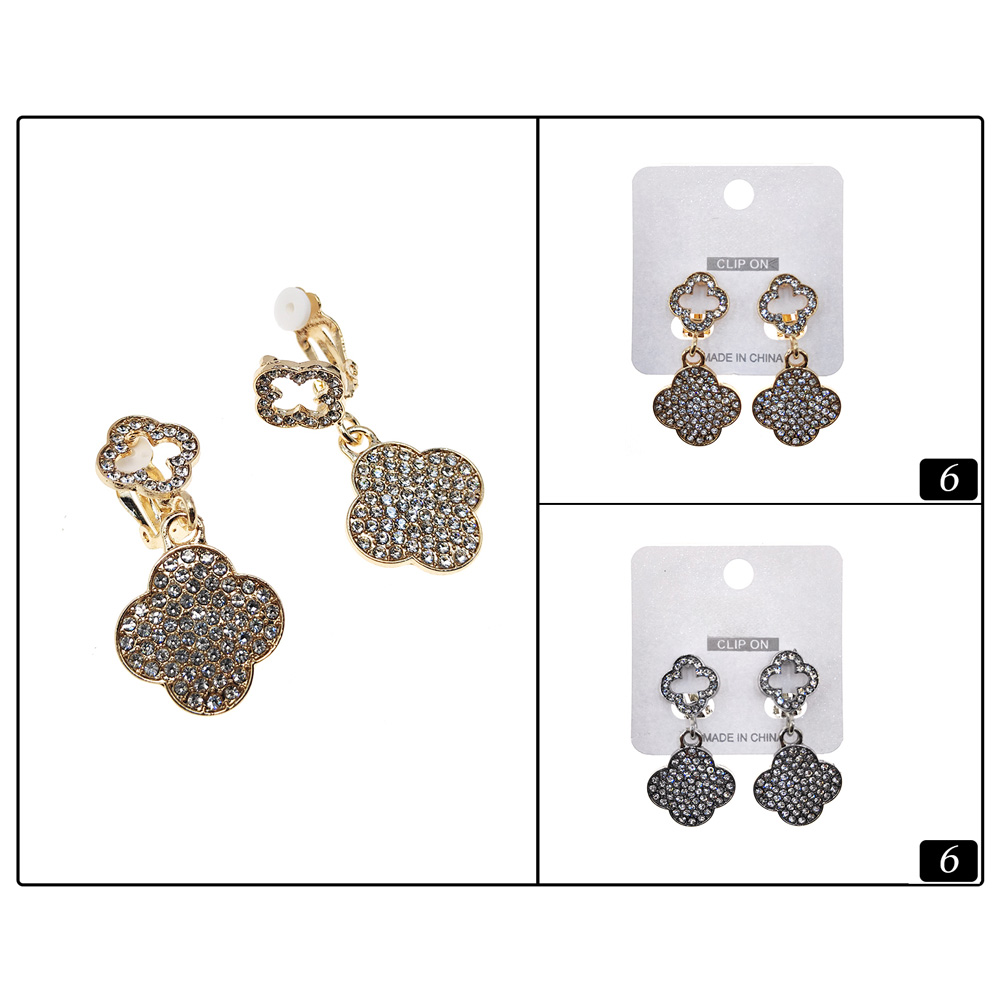 12Pairs - Stone Paved Quatrefoil Dangle Clip On Earrings
