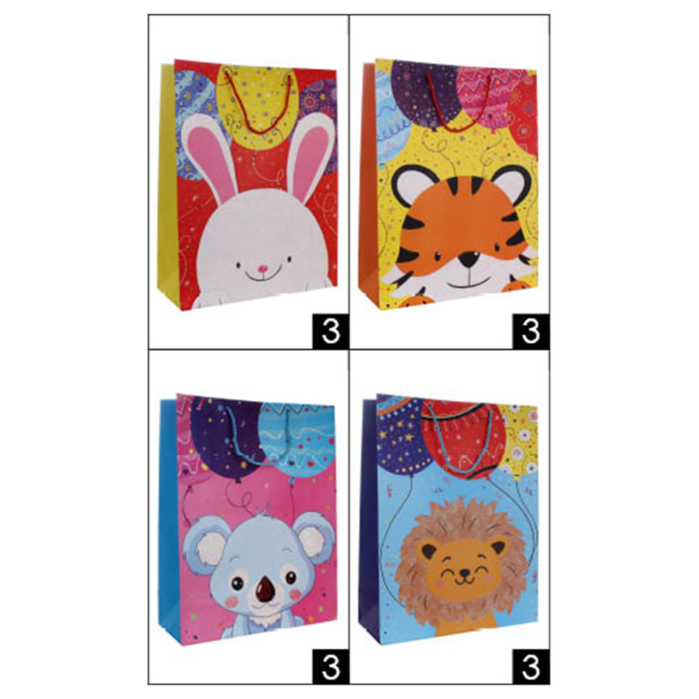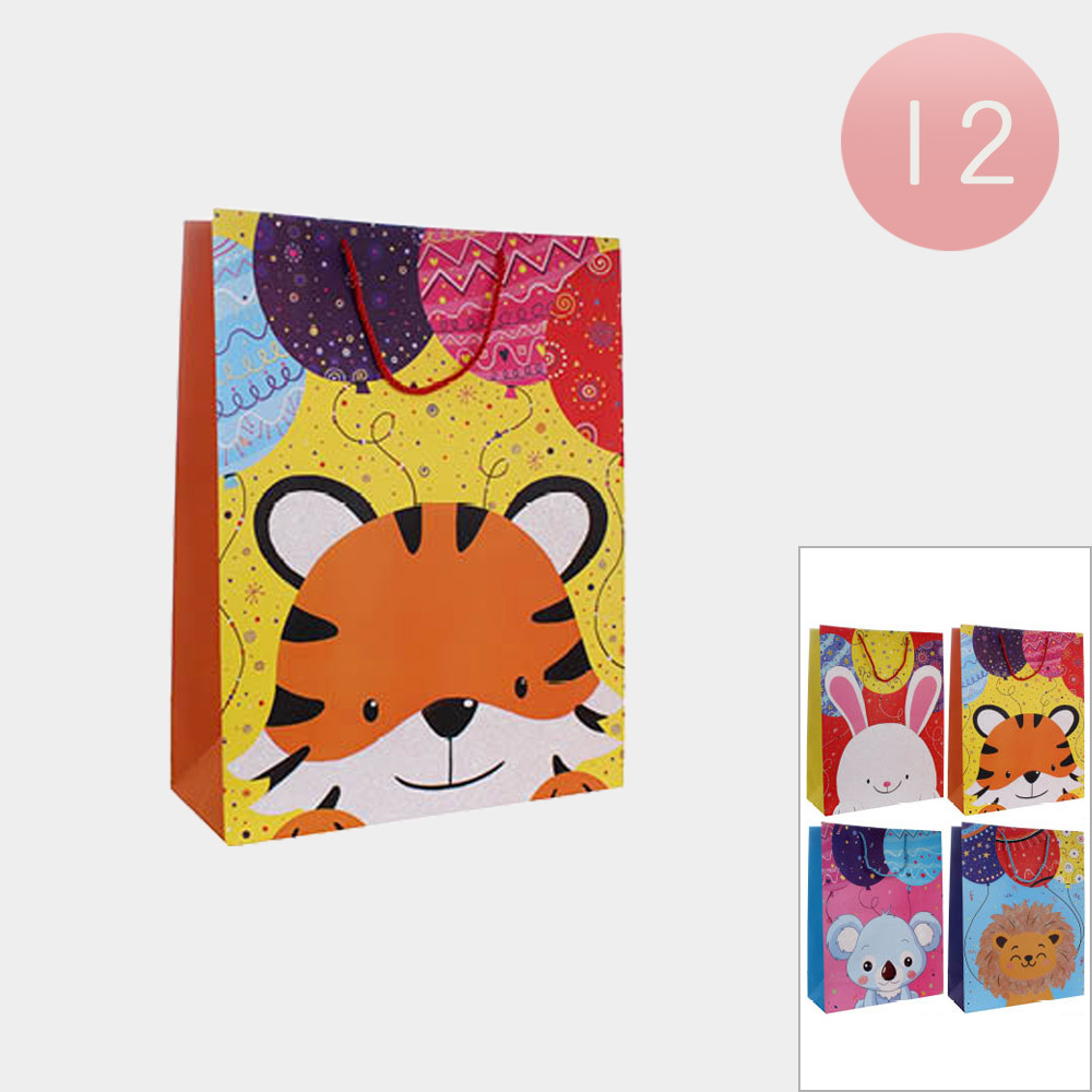 Details • Size : 12" X 15.75" X 4.75" • Adorable 12-pack animal gift bags featuring tiger, bunny, bear, and lion designs. Ideal for kids' parties, baby showers, or gift giving. Sturdy, colorful, and fun for every celebration.