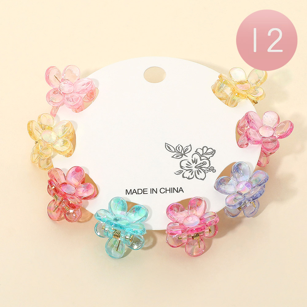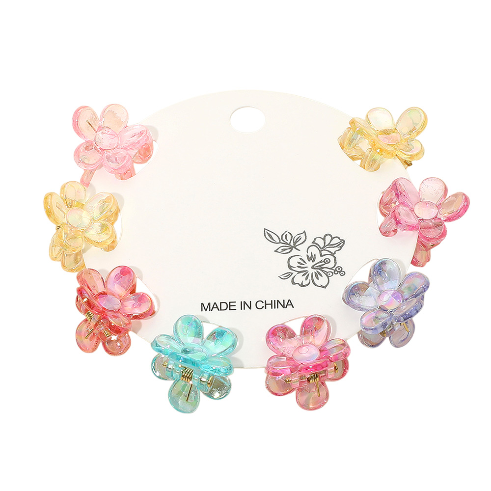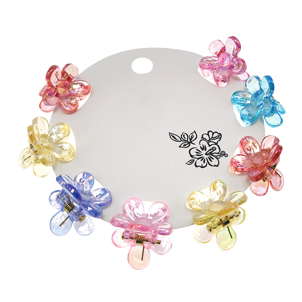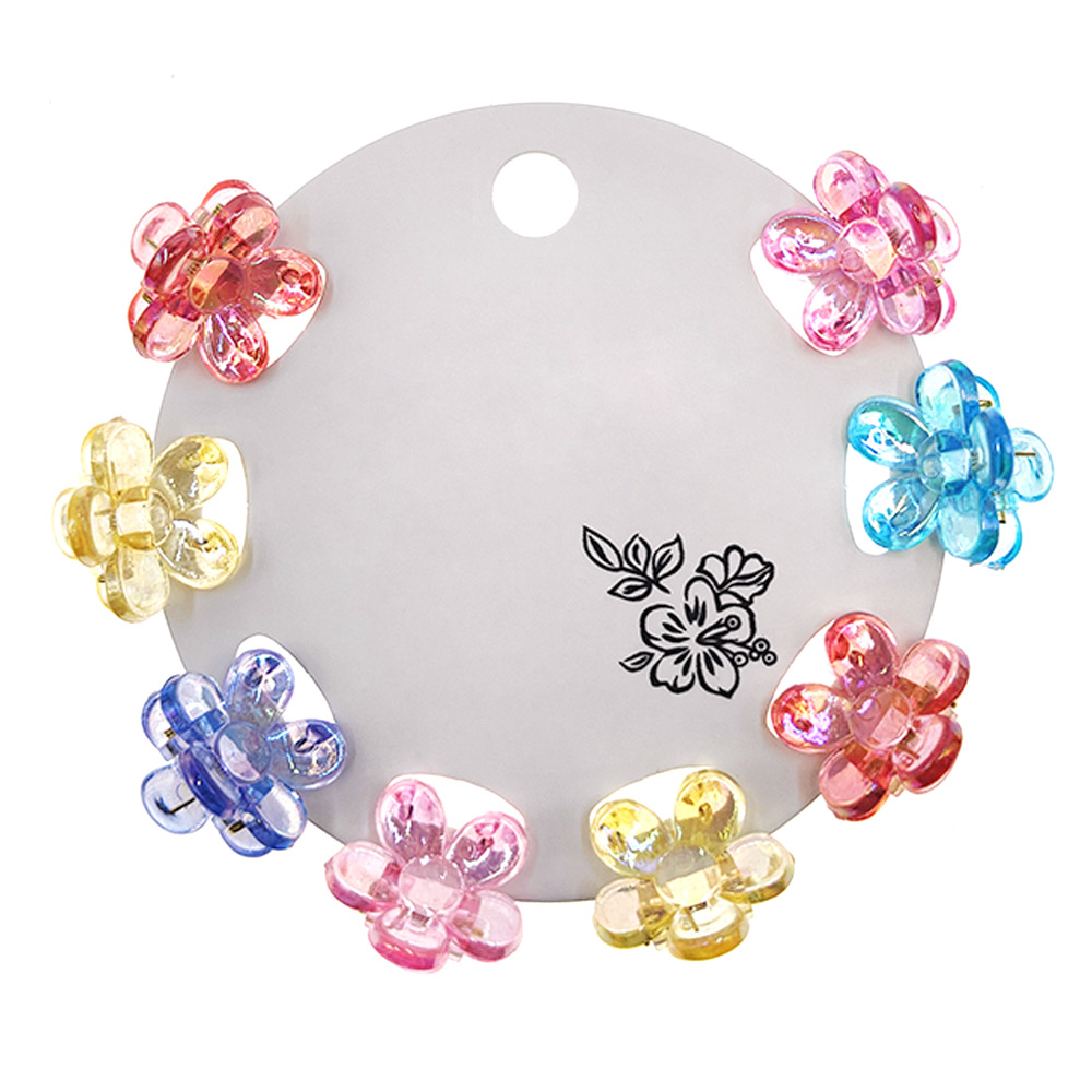 Details • Size : 0.75" X 0.75" • Delightful mini flower-shaped hair claw clips in a set of 8, designed for a charming and playful touch to any hairstyle. Lightweight and versatile, these clips are perfect for kids and adults to style and secure hair with ease.