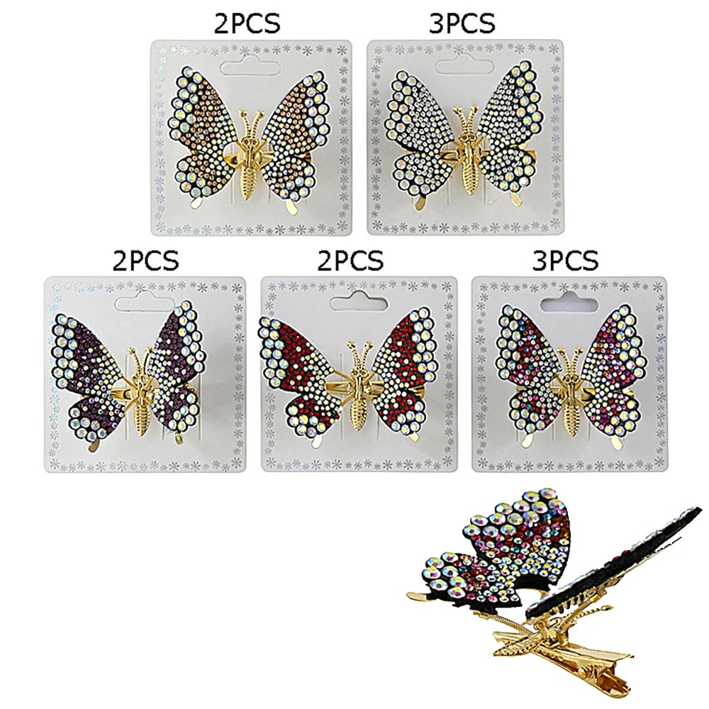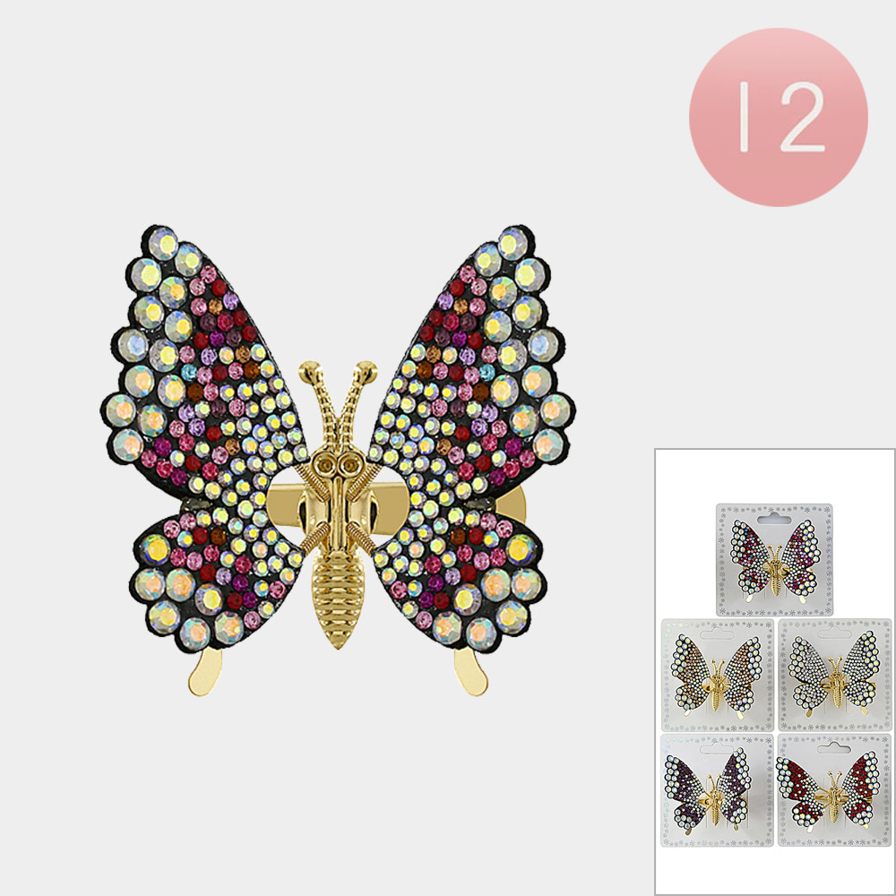 Details • Size : 2.6" X 2" • Alligator Snap • Elevate your hair game with this set of 12 rhinestone butterfly alligator clips, designed for a secure hold and brilliant shine. Each clip features dazzling stones arranged in vibrant butterfly patterns, perfect for special occasions or adding glamour to everyday looks.