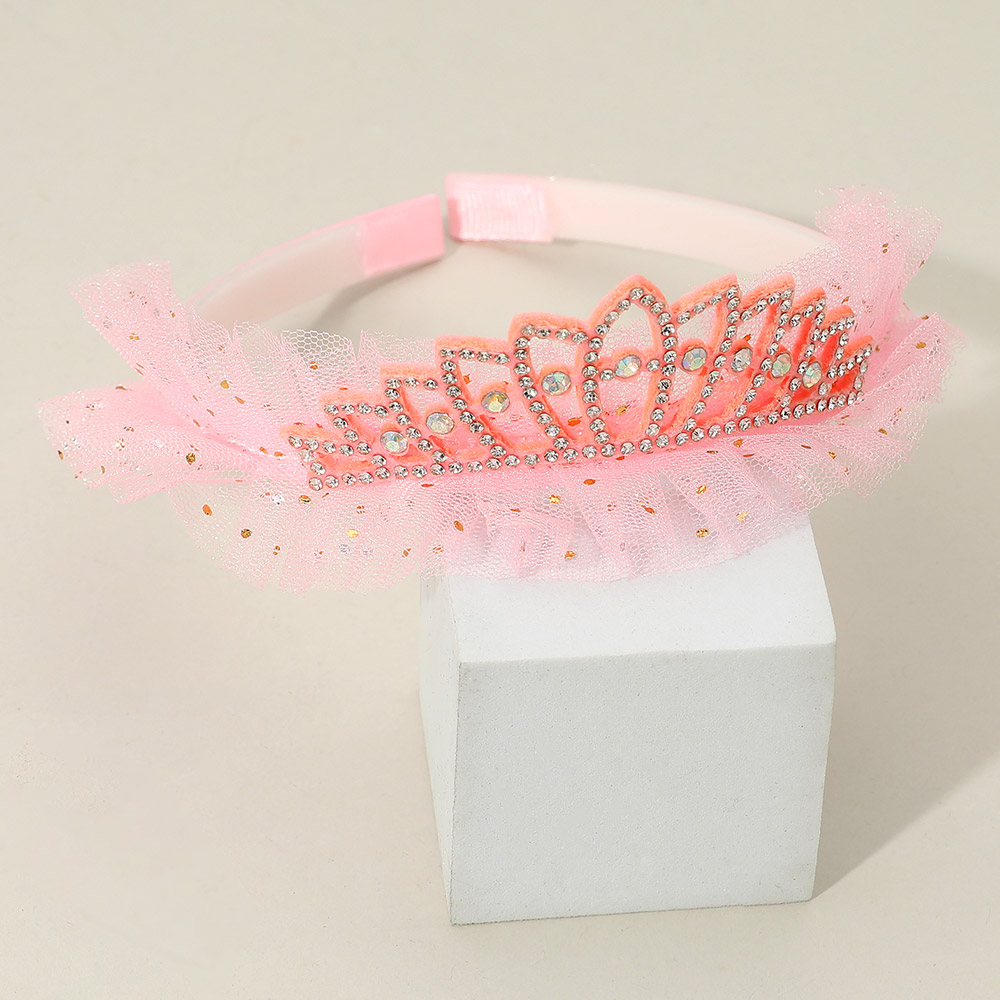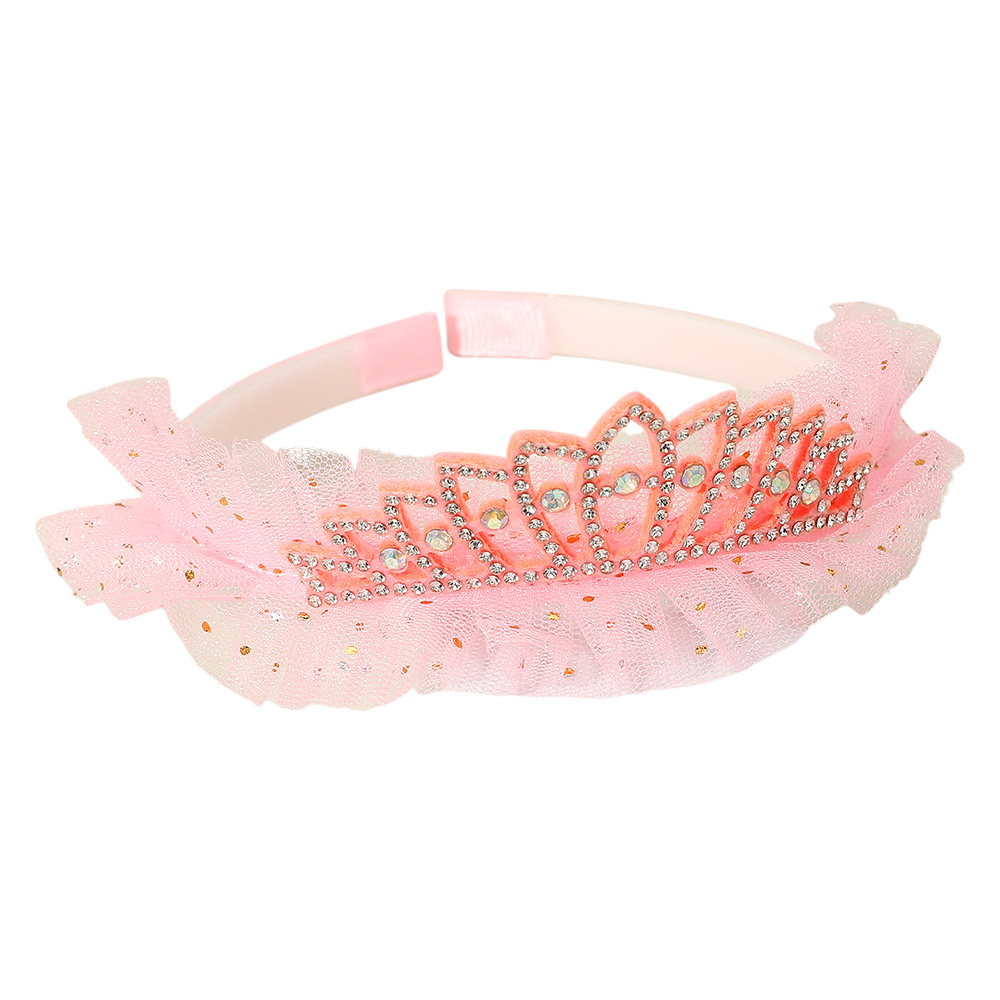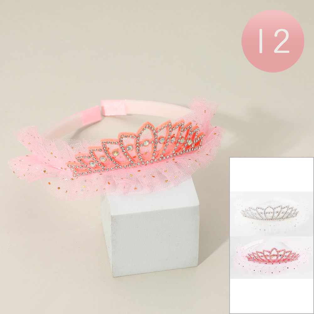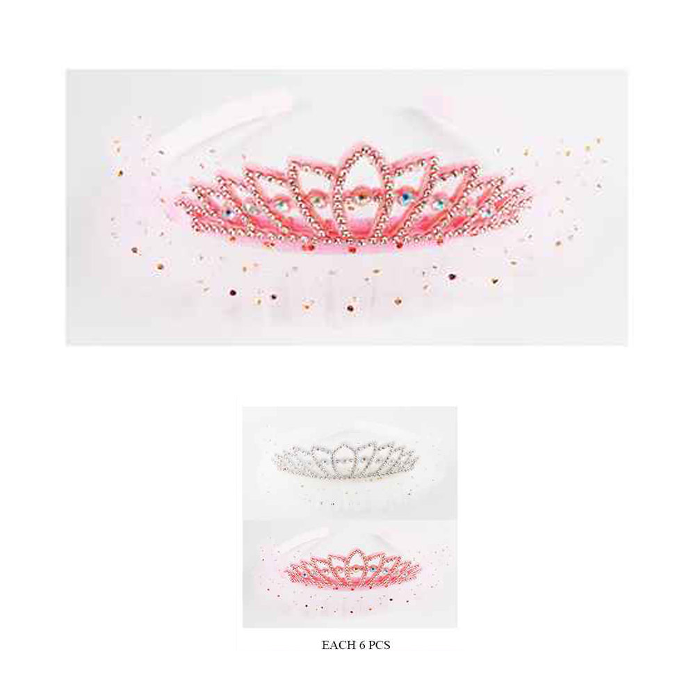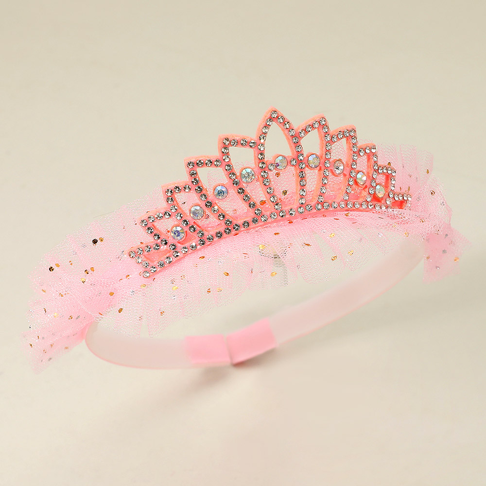 Details • Size : 1.5" H • Add a touch of sparkle to any dress-up day with this tiara headband featuring rhinestone accents and a soft tulle trim. Perfect for parties, playtime, or gifting, it brings a magical princess look to young fashionistas.