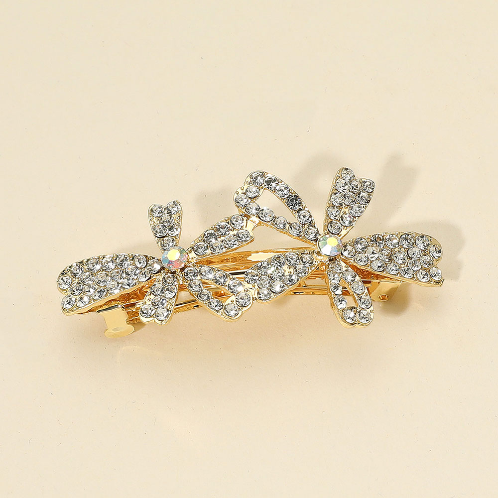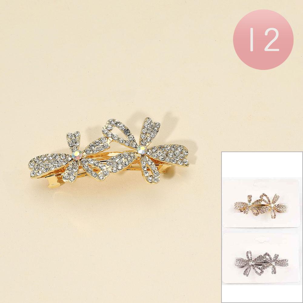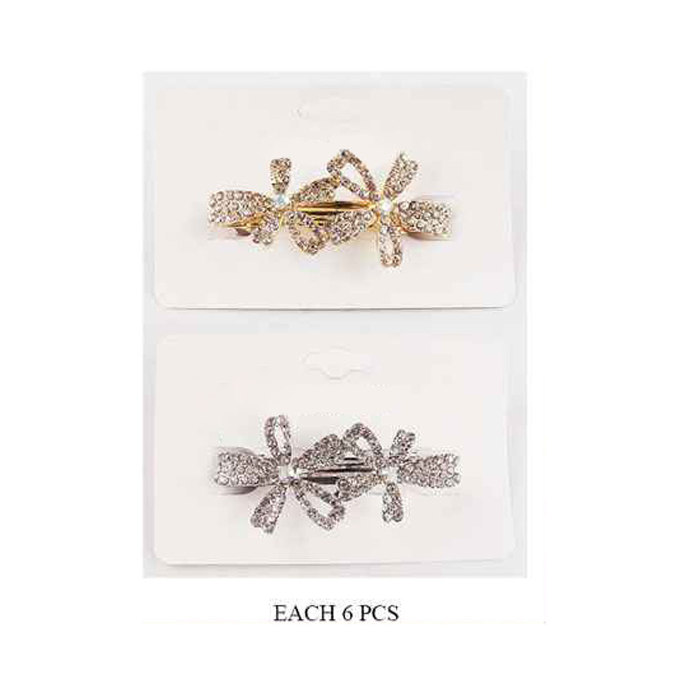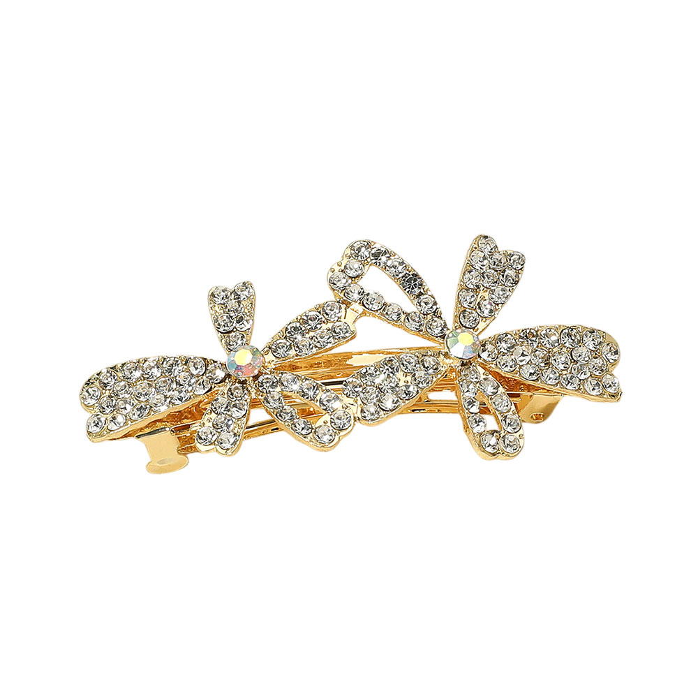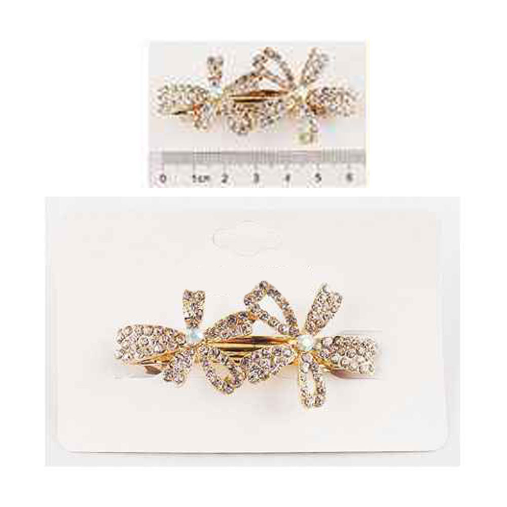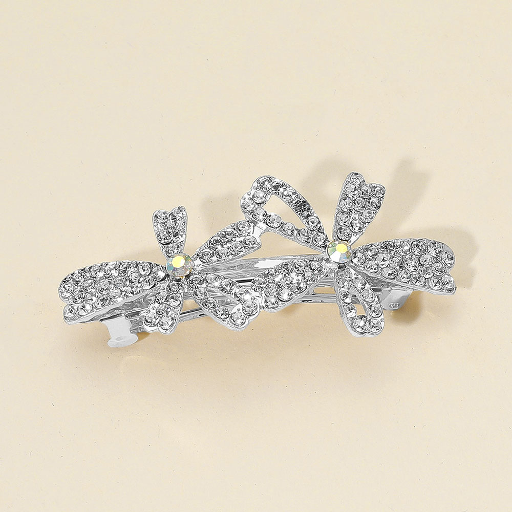 Details • Size : 2.6" X 1.25" • Barrette • Delicate flower bow hair clip adorned with shimmering rhinestones, perfect for elevating any hairstyle. Ideal for parties, weddings, and daily wear, offering secure hold and timeless charm for an effortlessly graceful look.