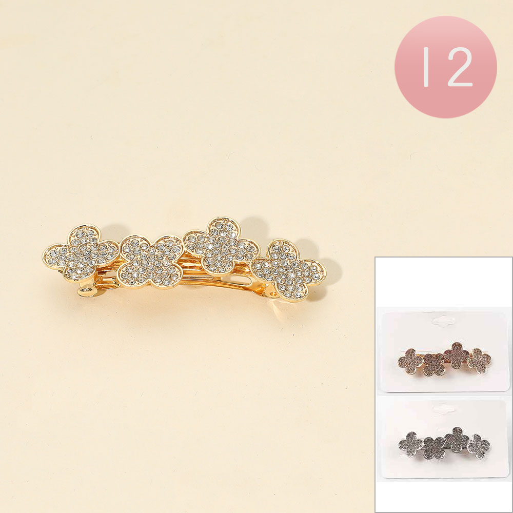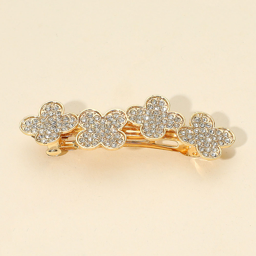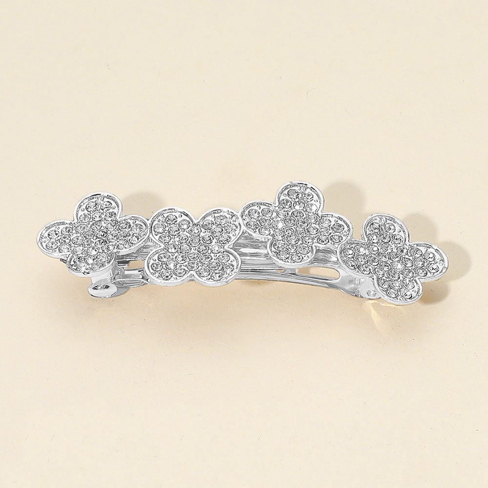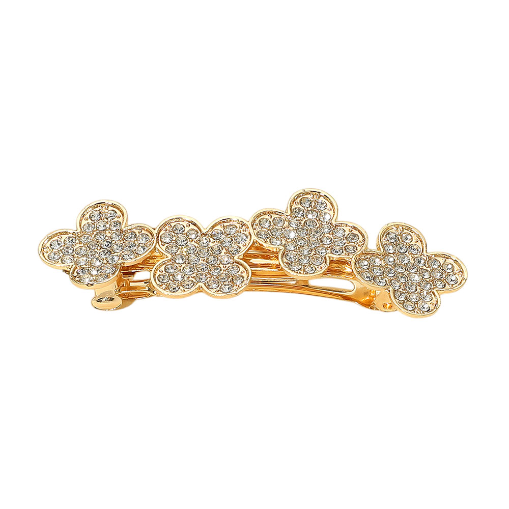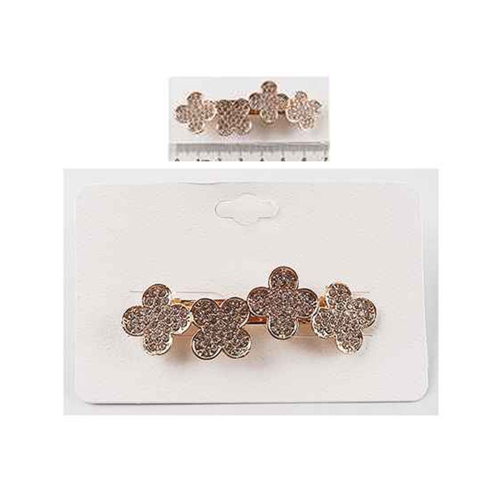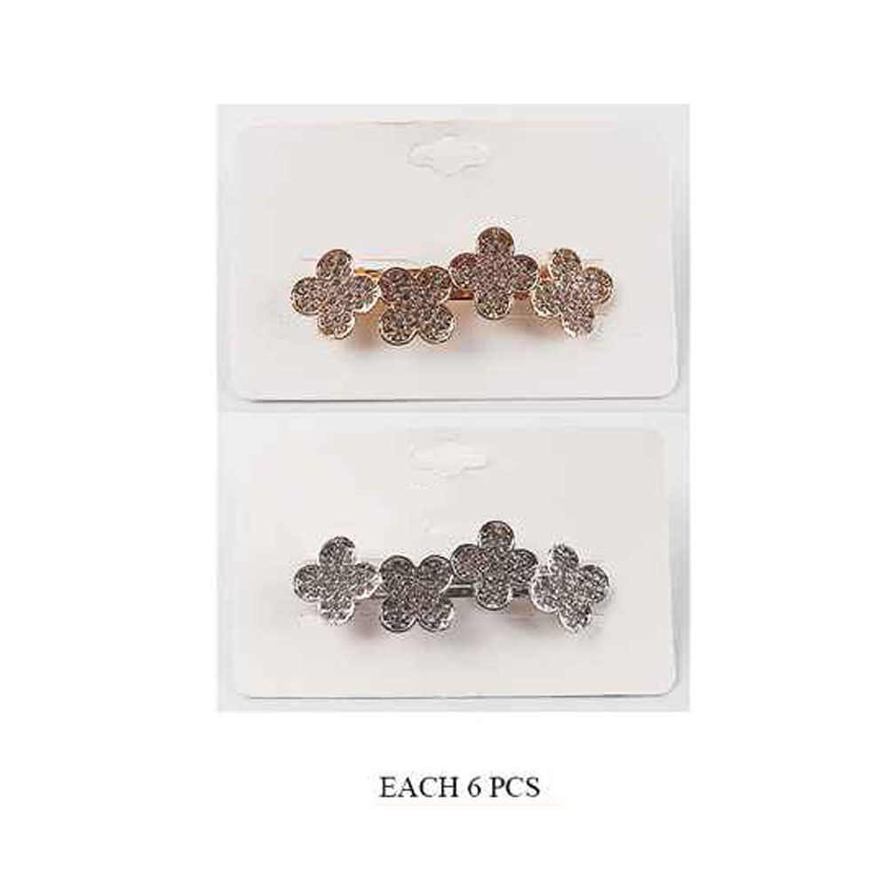 Details • Size : 2.75" X 0.75" • Barrette • Elegant quatrefoil-shaped hair clip adorned with shimmering rhinestones for a timeless, chic look. Perfect for adding sparkle to everyday styles or special occasions, offering secure hold and sophisticated charm in one stunning accessory.