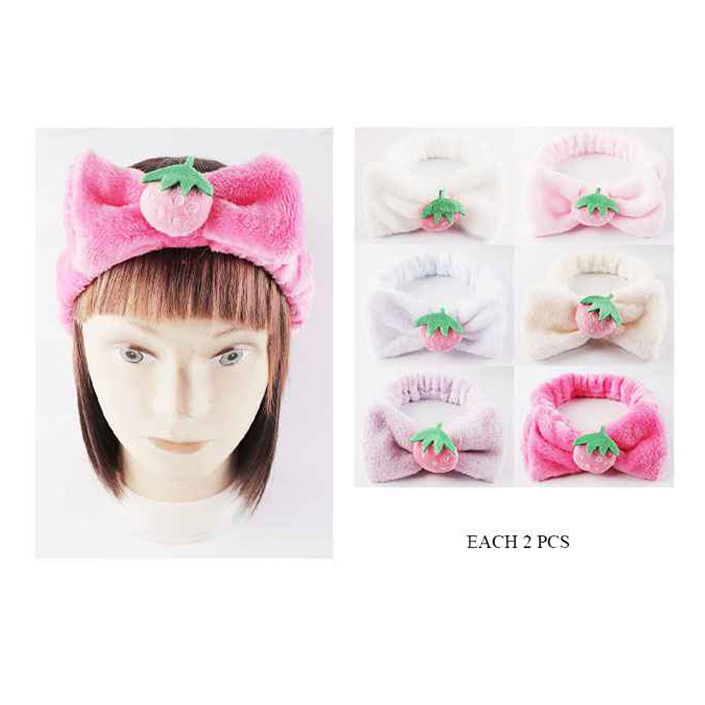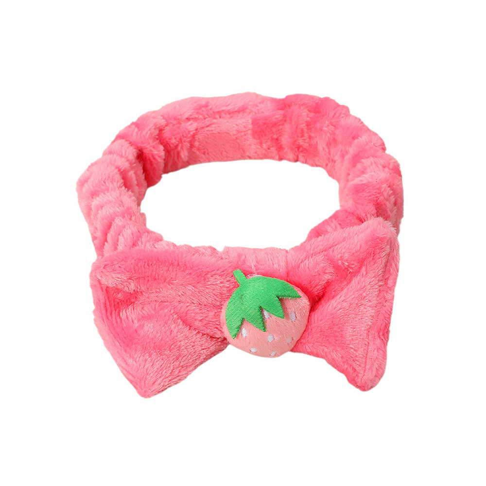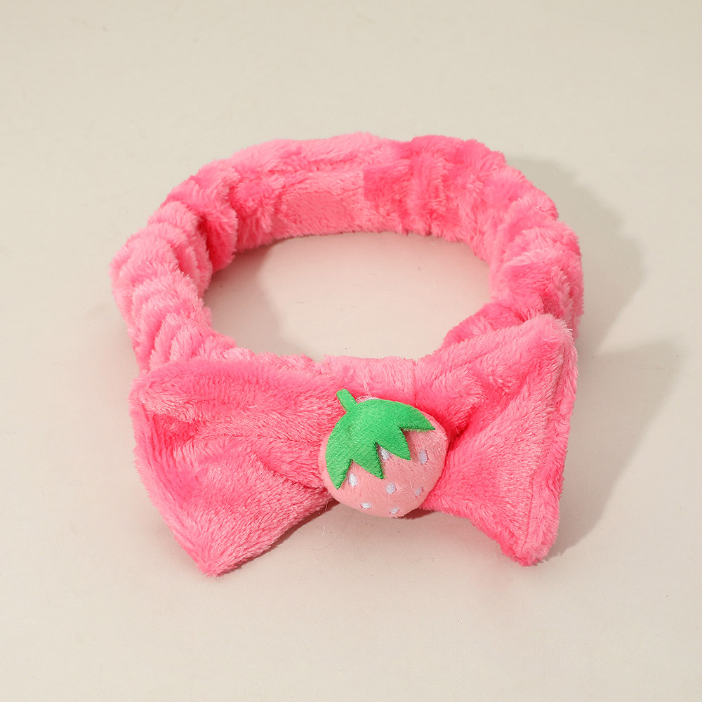 Details • Size : 2.75" H • Stretchable • Adorable plush headband featuring a bow and strawberry accent, perfect for skincare, makeup, or relaxing spa days. Stretchy, soft, and gentle on hair—adds fun and comfort to your daily beauty routine.