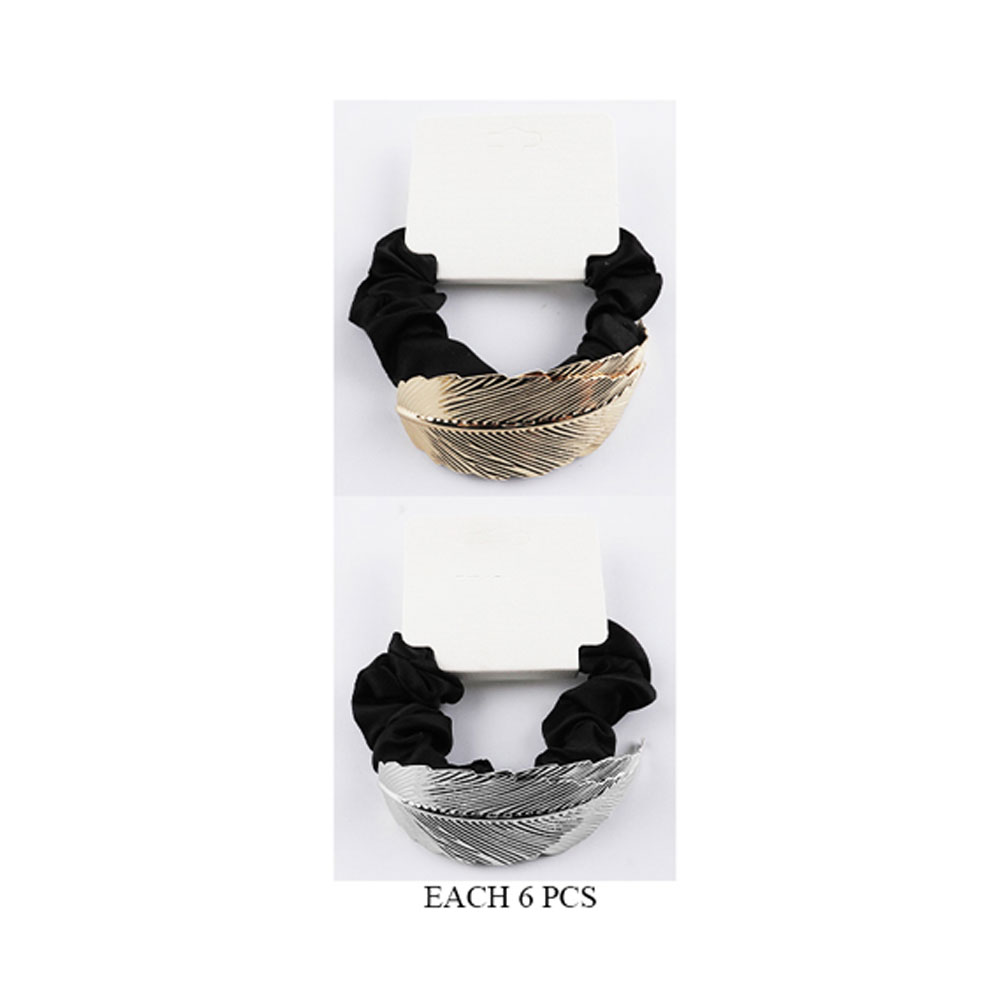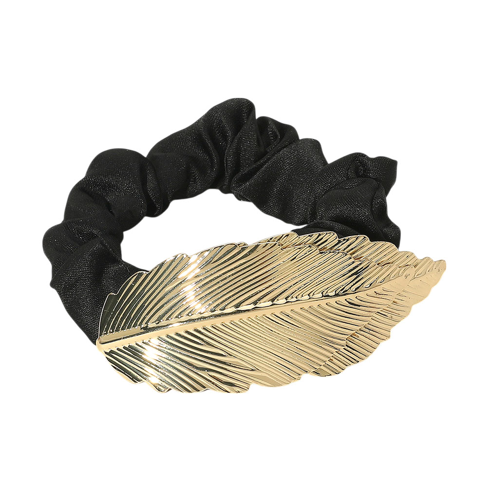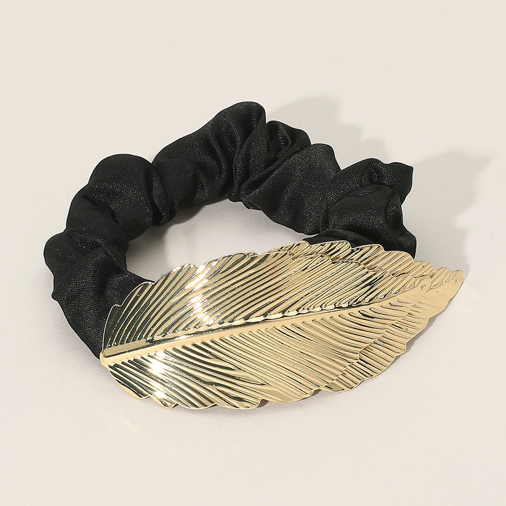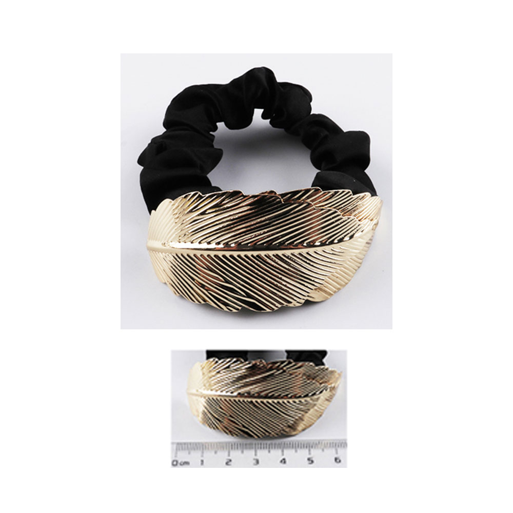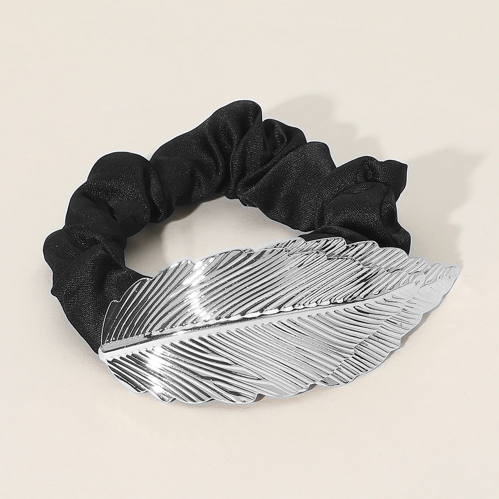 • Elevate your hairstyle with this sophisticated black scrunchie featuring a shiny metallic feather leaf accent in gold or silver. A chic and stylish accessory perfect for casual or dressy looks.
