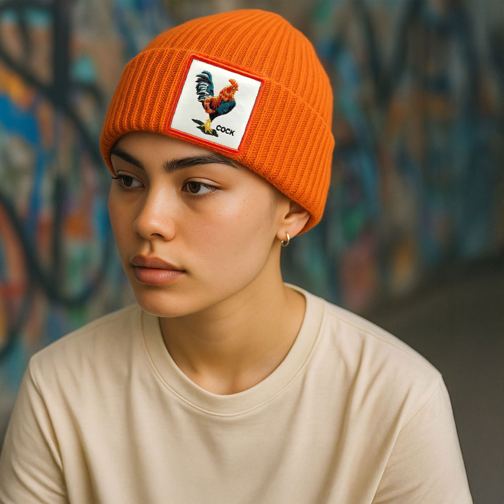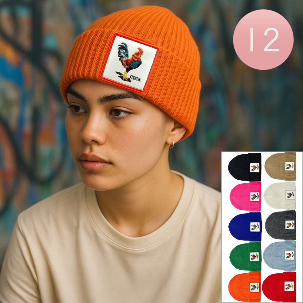 Details • Size : One Size • Material : 100% Acrylic • Trendy unisex beanie hat featuring a bold rooster patch design. Perfect for casual wear, outdoor activities, or street-style looks. Available in multiple colors to suit your unique style all season long.