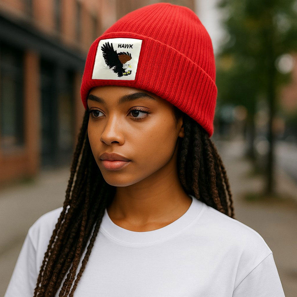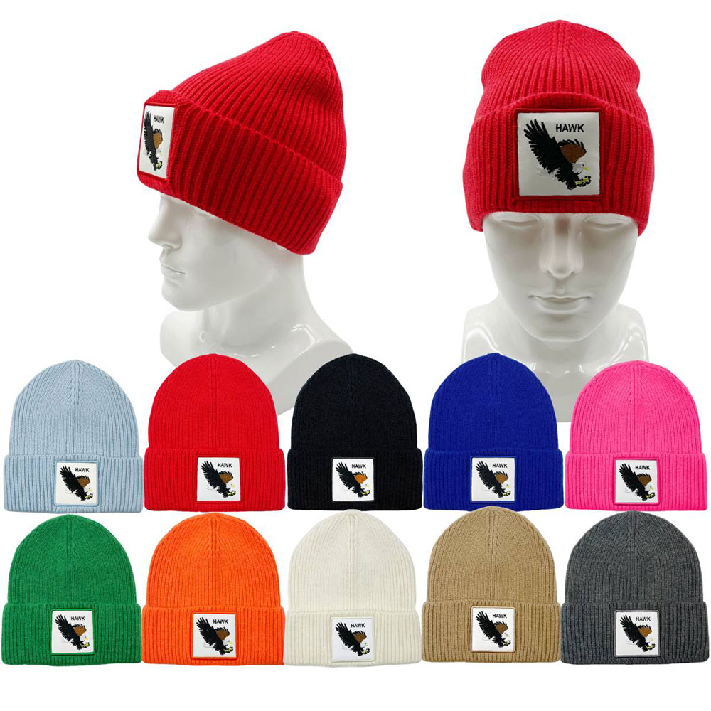 Details • Size : One Size • Material : 100% Acrylic • Fashionable unisex knit beanie hat featuring a bold hawk patch. Perfect for casual outfits, outdoor activities, and streetwear looks. Available in multiple color options for versatile styling during all seasons.