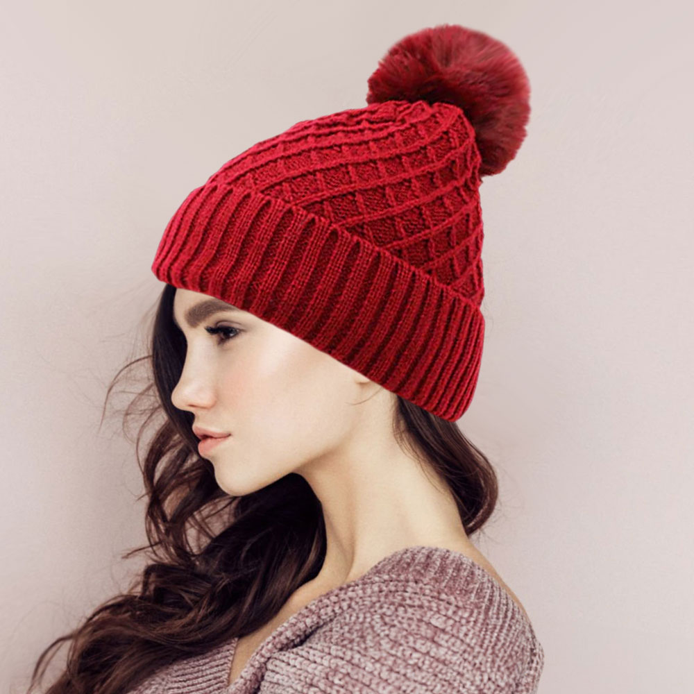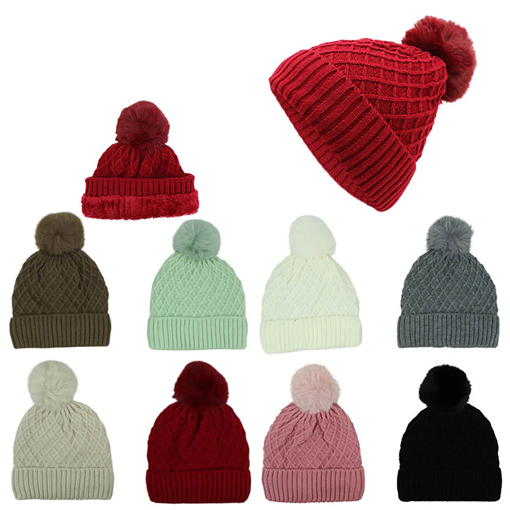 Details • Size : One Size • Material : 100% Acrylic • Stay cozy in style with this diamond-patterned knit beanie, topped with a fluffy pom pom and finished with a soft cuff. A perfect winter essential that blends warmth, texture, and trend in a fun and fashionable way.