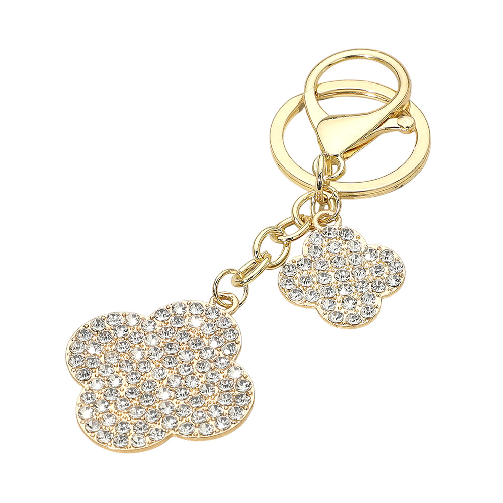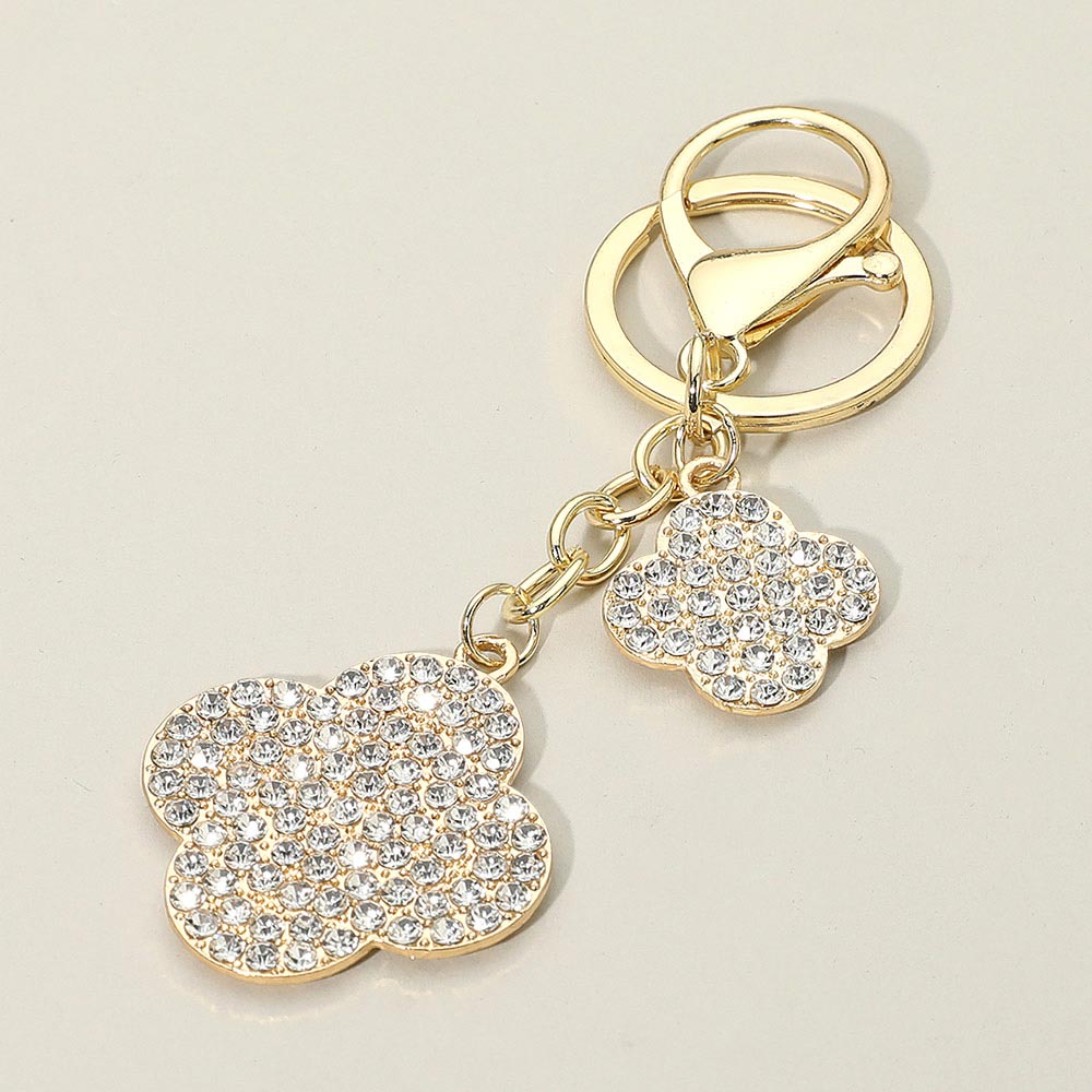 • Add shimmer and style to your everyday look with this Crystal Quatrefoil Keychain. Featuring dual four-leaf charms encrusted with sparkling stones, it’s perfect for enhancing handbags, backpacks, or car keys. A chic accessory and a thoughtful gift for any occasion.