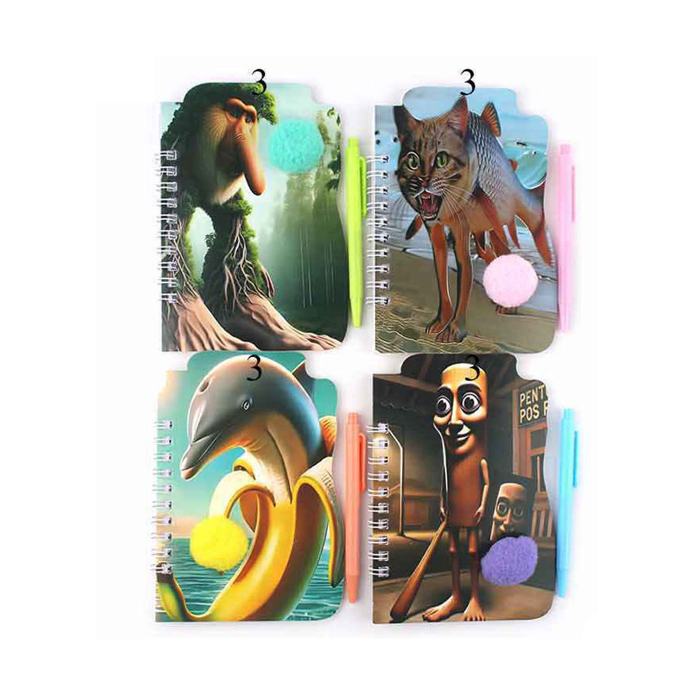 Details • Note Size : 4" X 5.5" • Pen Size : 4" L • Add fun to note-taking with this assorted animal-themed notebook and pen set. Each spiral-bound notebook features a playful 3D cover with a soft pom pom accent and comes paired with a matching pen. Ideal for kids’ school supplies, party favors, or creative journaling activities.