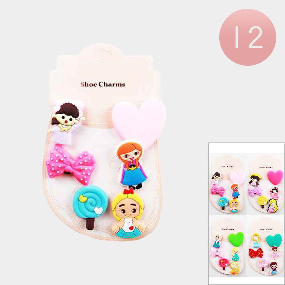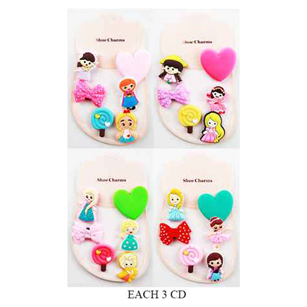 Details • Size : 1.25" L - 1.5" L • Add a touch of whimsy to your footwear with this 6-piece set of fairytale-inspired shoe charms. Featuring cute characters, hearts, and sweets, they're perfect for customizing clogs and kids’ shoes.