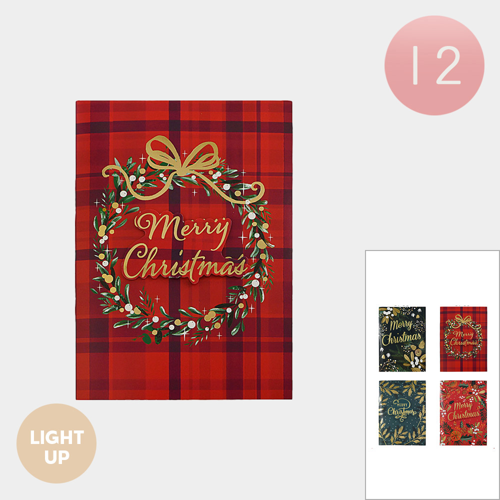 Details • Size : 5.75" X 7.75" • Envelope Size : 6" X 8" • Brighten the holidays with these light-up Christmas greeting cards featuring elegant wreath and festive designs. Perfect for sharing warm wishes, these charming cards combine traditional holiday style with a glowing touch for extra seasonal cheer.