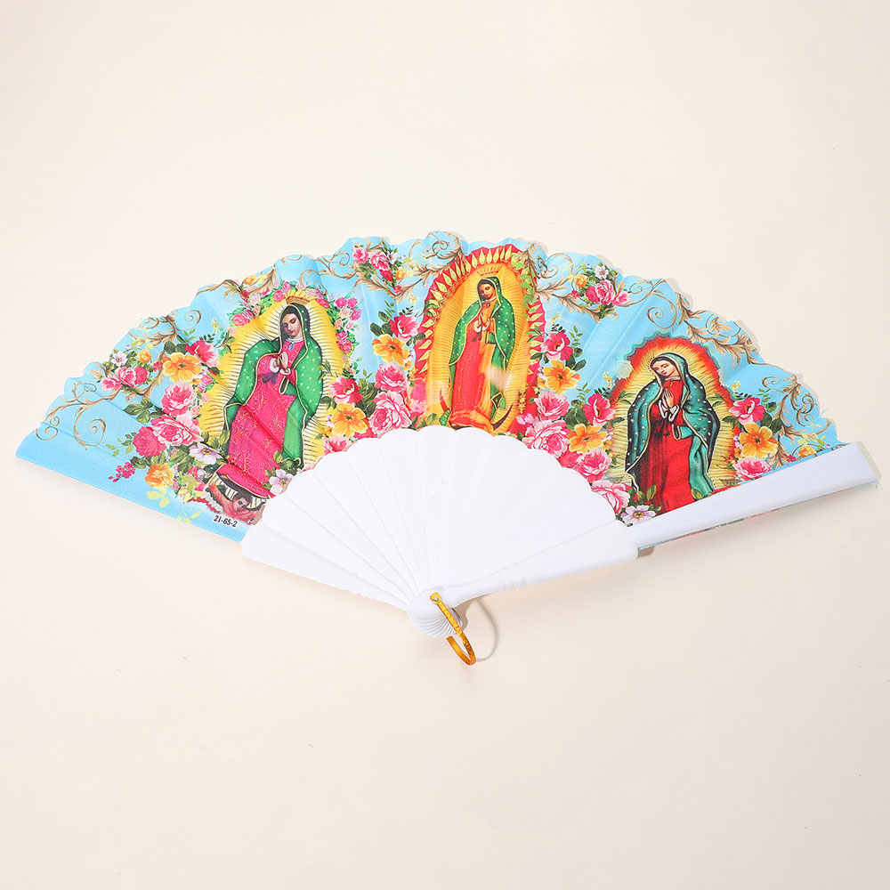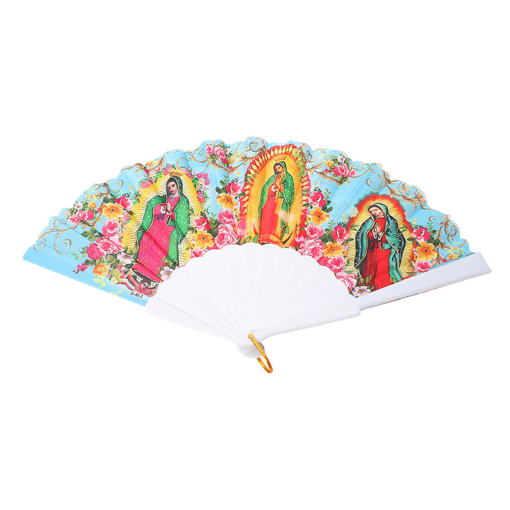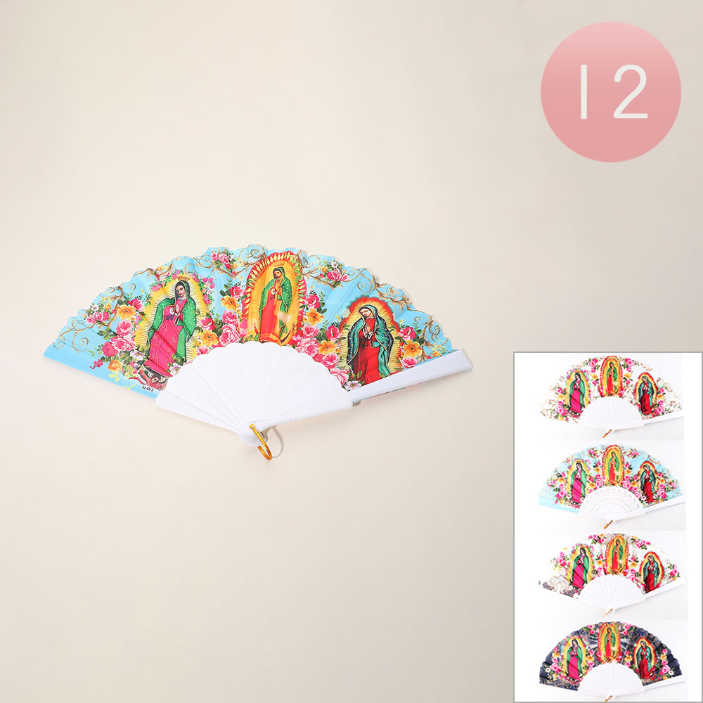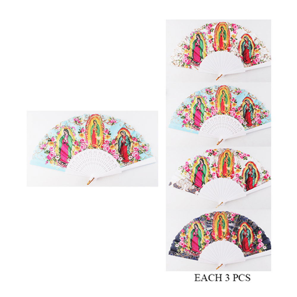 • Pack of 12 devotional hand fans featuring the Virgin of Guadalupe with floral accents in assorted colors. Ideal for religious events, church giveaways, or as meaningful spiritual keepsakes.