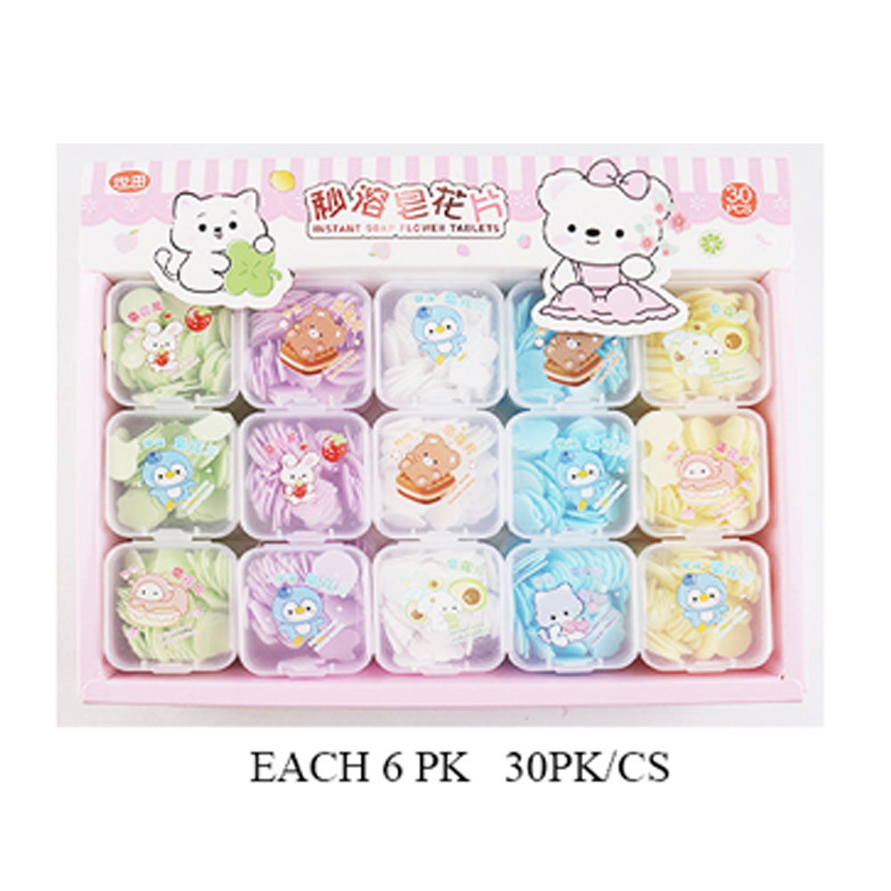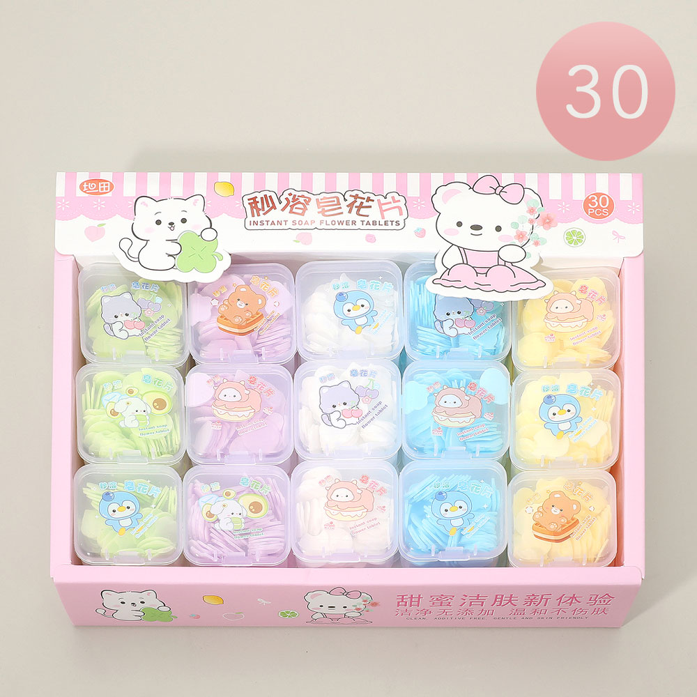 Details • Size : 1.75" X 1.75" X 0.75" • Adorable 30-pack of instant soap flower tablets with fun animal-themed containers. Each compact box includes single-use soap petals for easy handwashing anywhere. Ideal for travel, school, or gifting—adds a cute and hygienic touch to everyday routines.