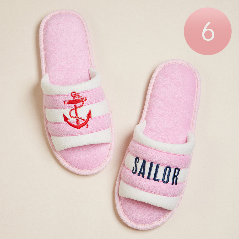 6Pairs - Anchor Sailor Message Embroidered Striped Pool Side Slippers / Home Indoor Floor Slippers