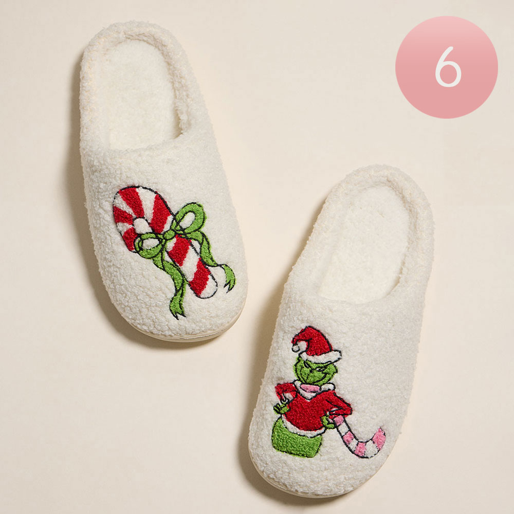 • Bring playful holiday vibes to your downtime with these ultra-soft fuzzy slippers featuring a candy cane and festive character design. Perfect for lounging in cozy comfort all season long.