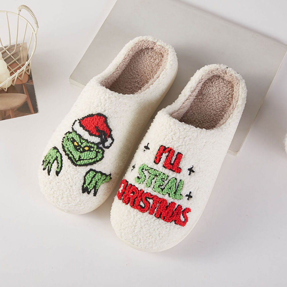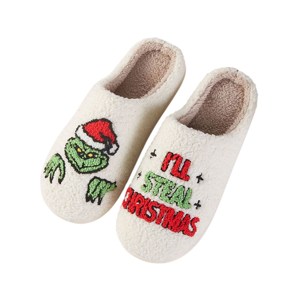 • Festive fleece-lined slippers featuring playful holiday embroidery and soft cushioned insoles. These warm, slip-on slippers combine humor and comfort for relaxed lounging during the season. Made of polyester and PVC.