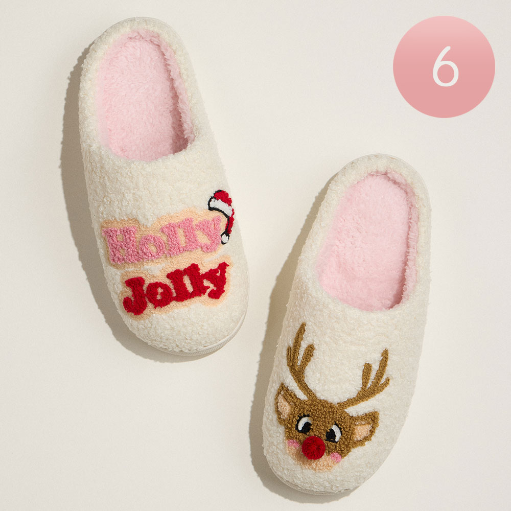 6Pairs - Holly Jolly Reindeer Fuzzy Indoor Slippers