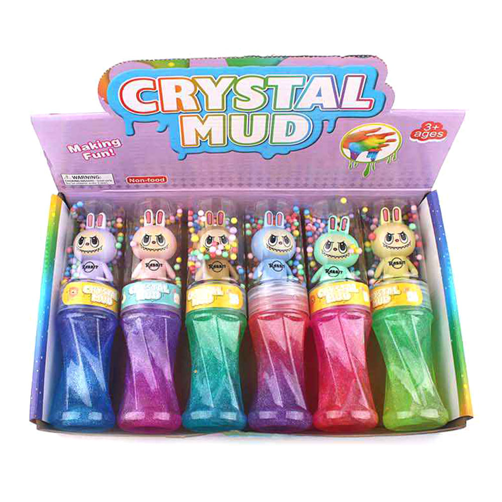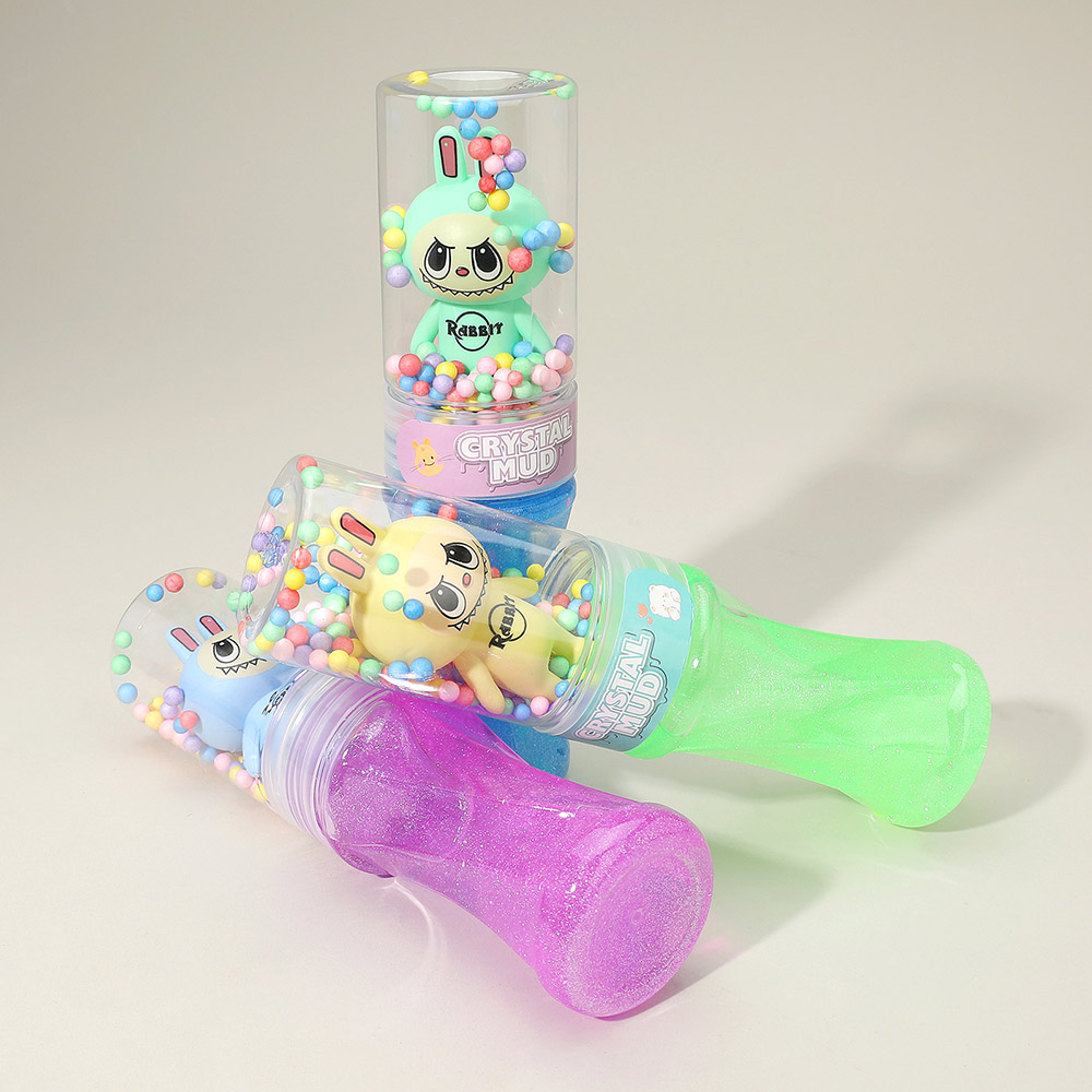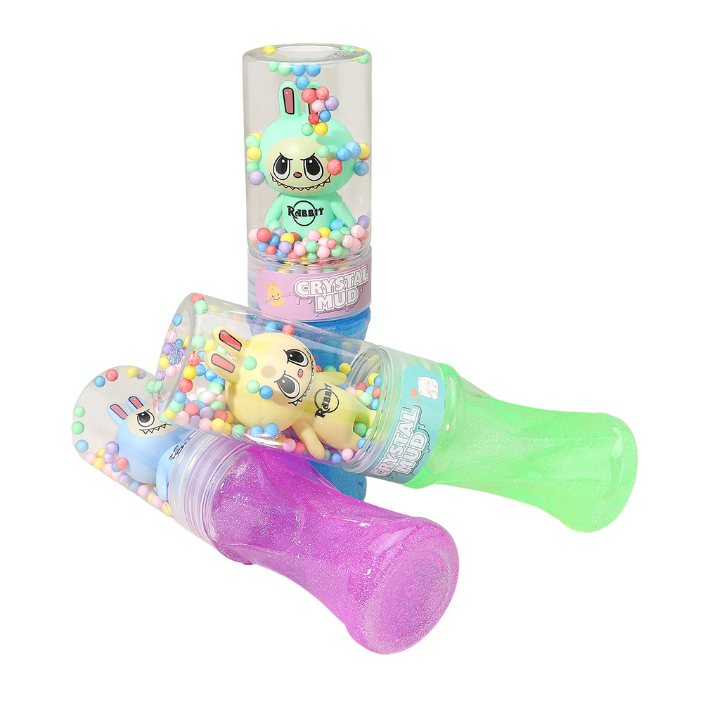 • Crystal mud slime toy set featuring cute bunny character containers filled with glitter slime and foam beads. Stretchy, soft, and fun to squish, perfect for sensory play, party favors, or stress relief. A playful and colorful way for kids to enjoy creative hands-on entertainment.