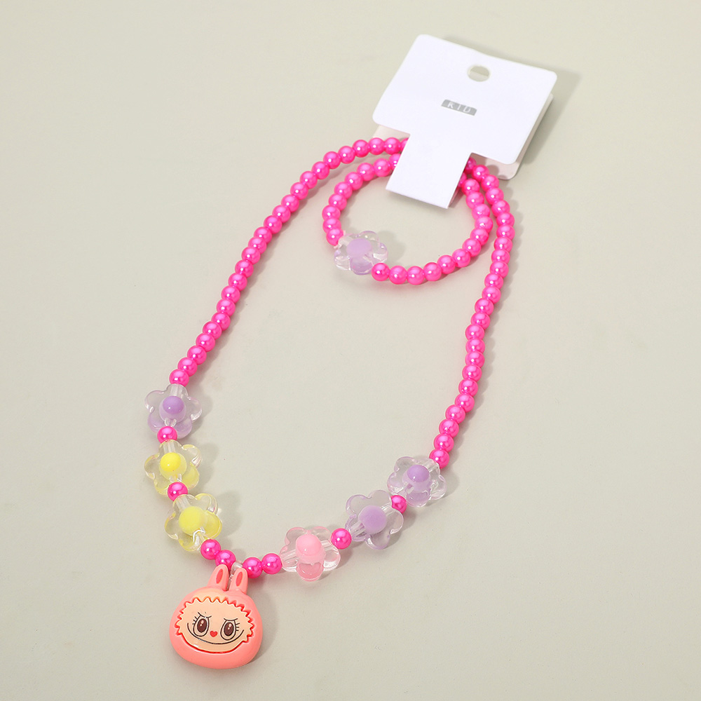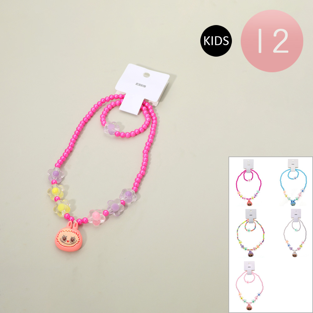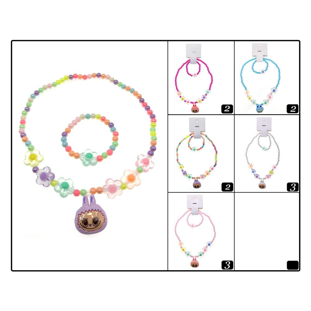 Details • Necklace Size : 9" L / Stretchable • Pendant Size : 1.3" L • Bracelet Size : 0.7" H / Stretchable • Charming kids’ necklace set featuring playful beads and a fun character charm. With stretch design for easy wear, this 12-piece pack makes perfect party favors, birthday gifts, or everyday accessories, adding a cheerful touch to children’s outfits and jewelry collections.