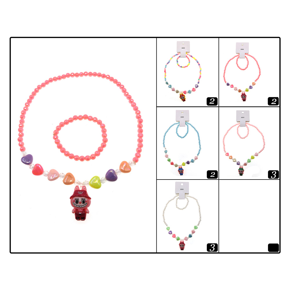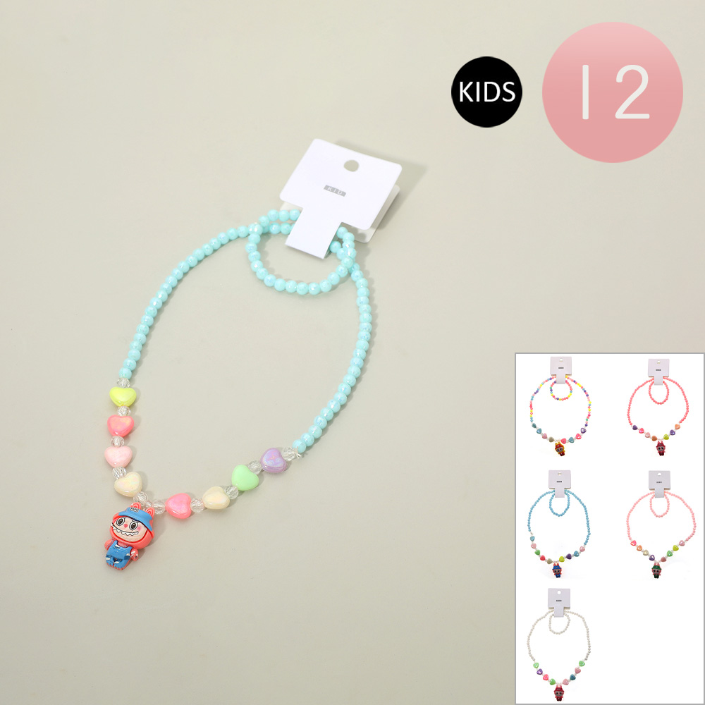 Details • Necklace Size : 9" L / Stretchable • Pendant Size : 1.3" L • Bracelet Size : 0.25" H / Stretchable • Playful kids’ necklace and bracelet set designed with cute beads and a cheerful charm. Perfect as party favors, birthday gifts, or daily accessories, this 12-piece pack brings joy, style, and comfort to children’s jewelry collections, making dress-up and playtime extra fun.