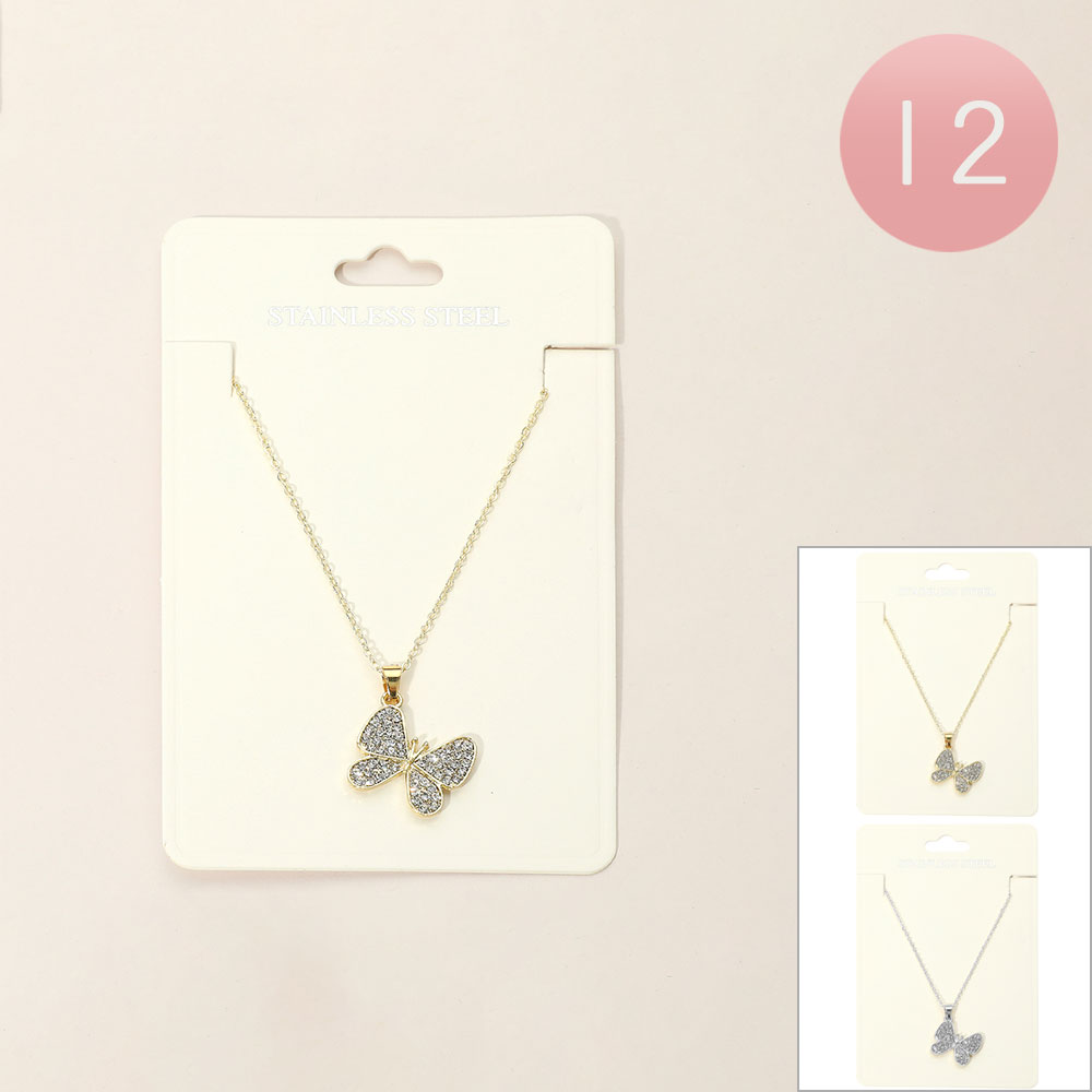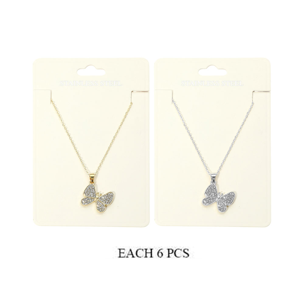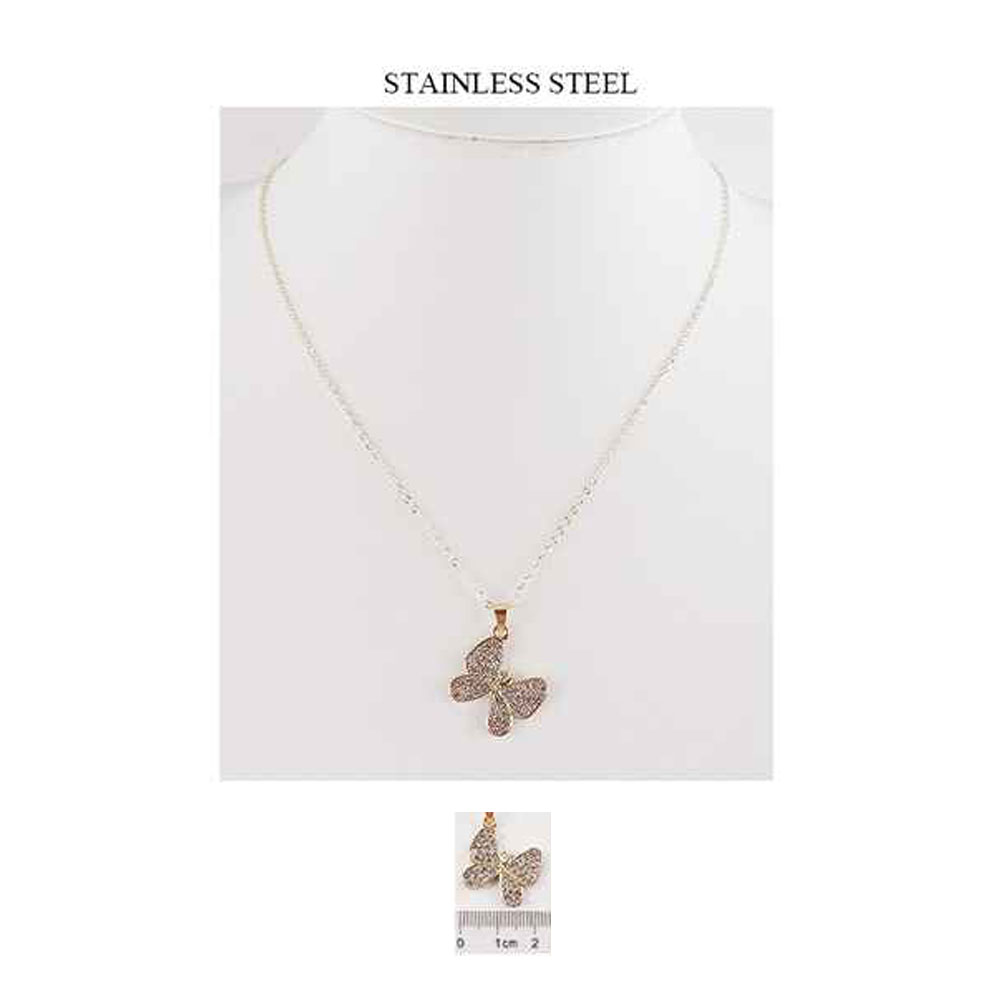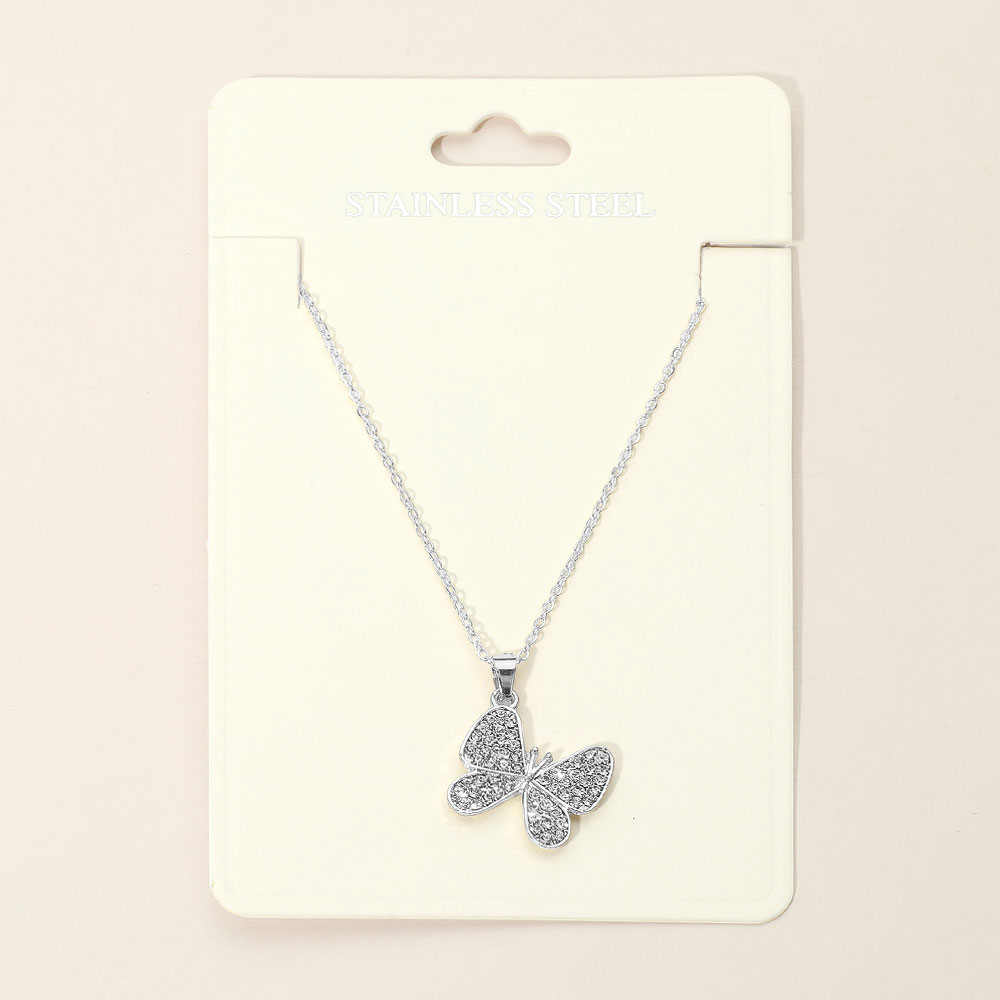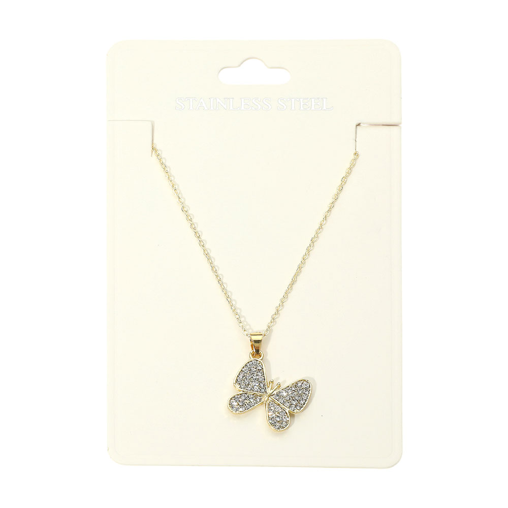 Details • Necklace Size : 18" L • Pendant Size : 0.9" X 1.25" • Add a touch of elegance with this butterfly pendant necklace, featuring shimmering stones on stainless steel. Tarnish-resistant and hypoallergenic—perfect for sensitive skin. Available in gold and silver tones for versatile, everyday glam. • Stainless Steel