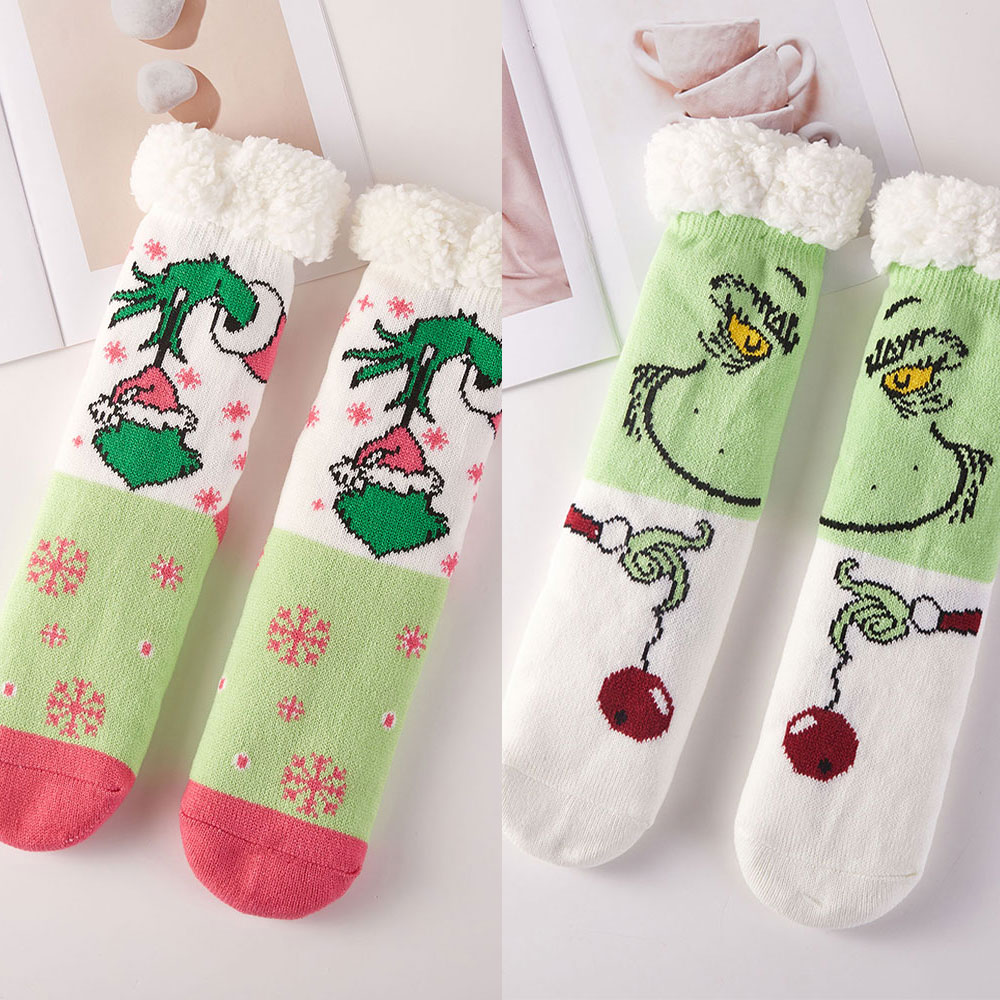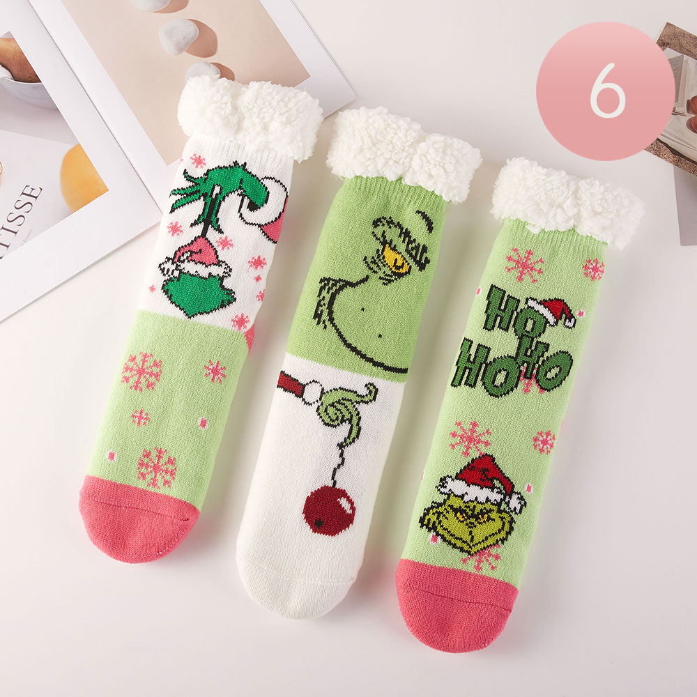 Details • Size : 9 - 11 • Material : 100% Polyester • Fun and festive Green Monster Santa-themed Christmas socks with soft lining and non-slip grips. Features holiday patterns perfect for winter lounging or gifting. Includes assorted designs in one cozy seasonal set.