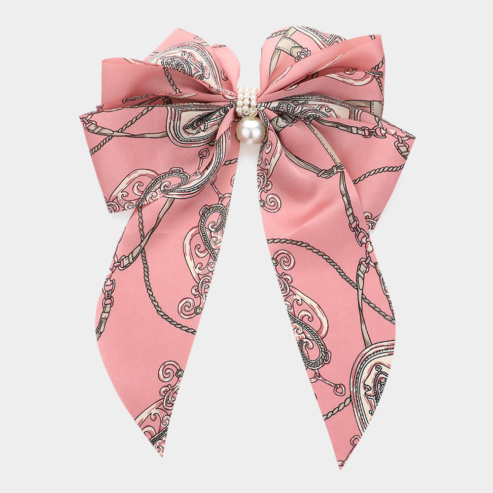 Oversized Pearl Dangle Pointed Chain Pattern Bow Barrette