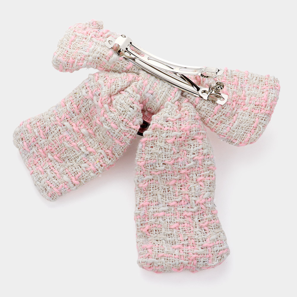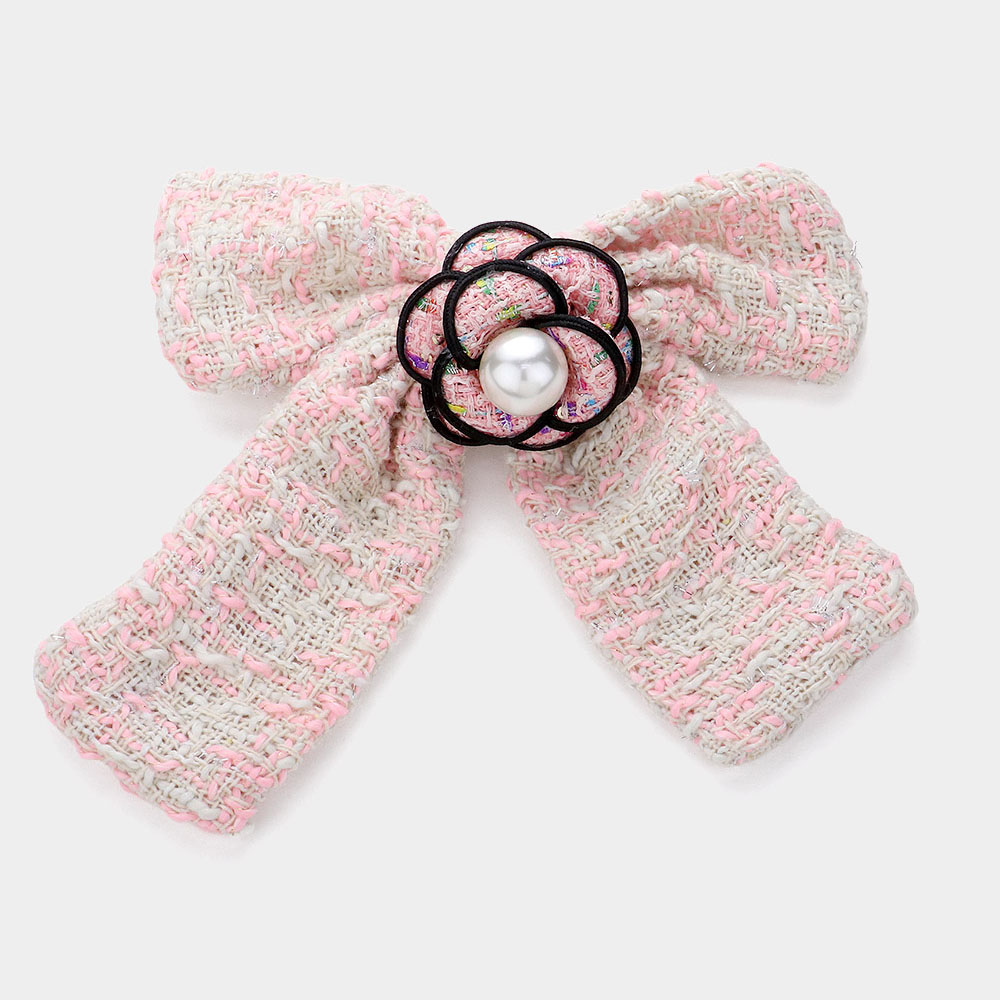 Pearl Pointed Flower Center Tweed Bow Barrette