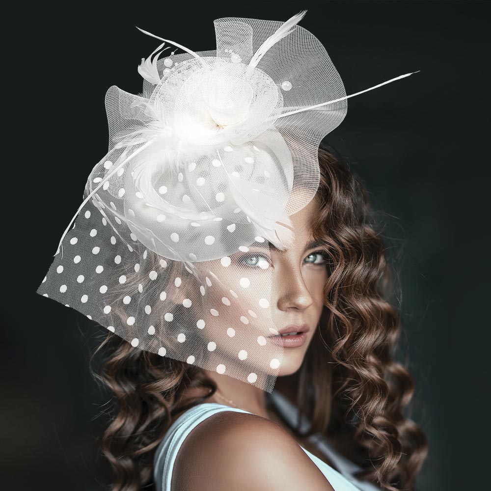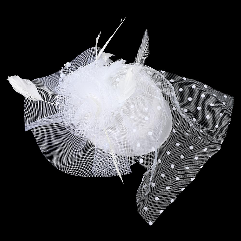 Details • Size : 9" X 12" • Dual : Hair Pinch Clip / Headband • Turn heads with this elegant polka dot fascinator featuring a delicate mesh veil, rosette accent, and graceful feather details. Perfect for weddings, cocktail parties, and special events, this chic headpiece adds a vintage-inspired touch of glamour to any formal outfit or occasion look.